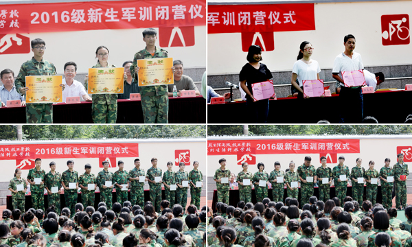 然后,学生处张海震主任宣读了《关于表彰2016年军训先进班级及个人的通报》,校领导为此次军训活动中表现突出的先进集体和个人颁发了荣誉证书,优秀学员代表作了发言。