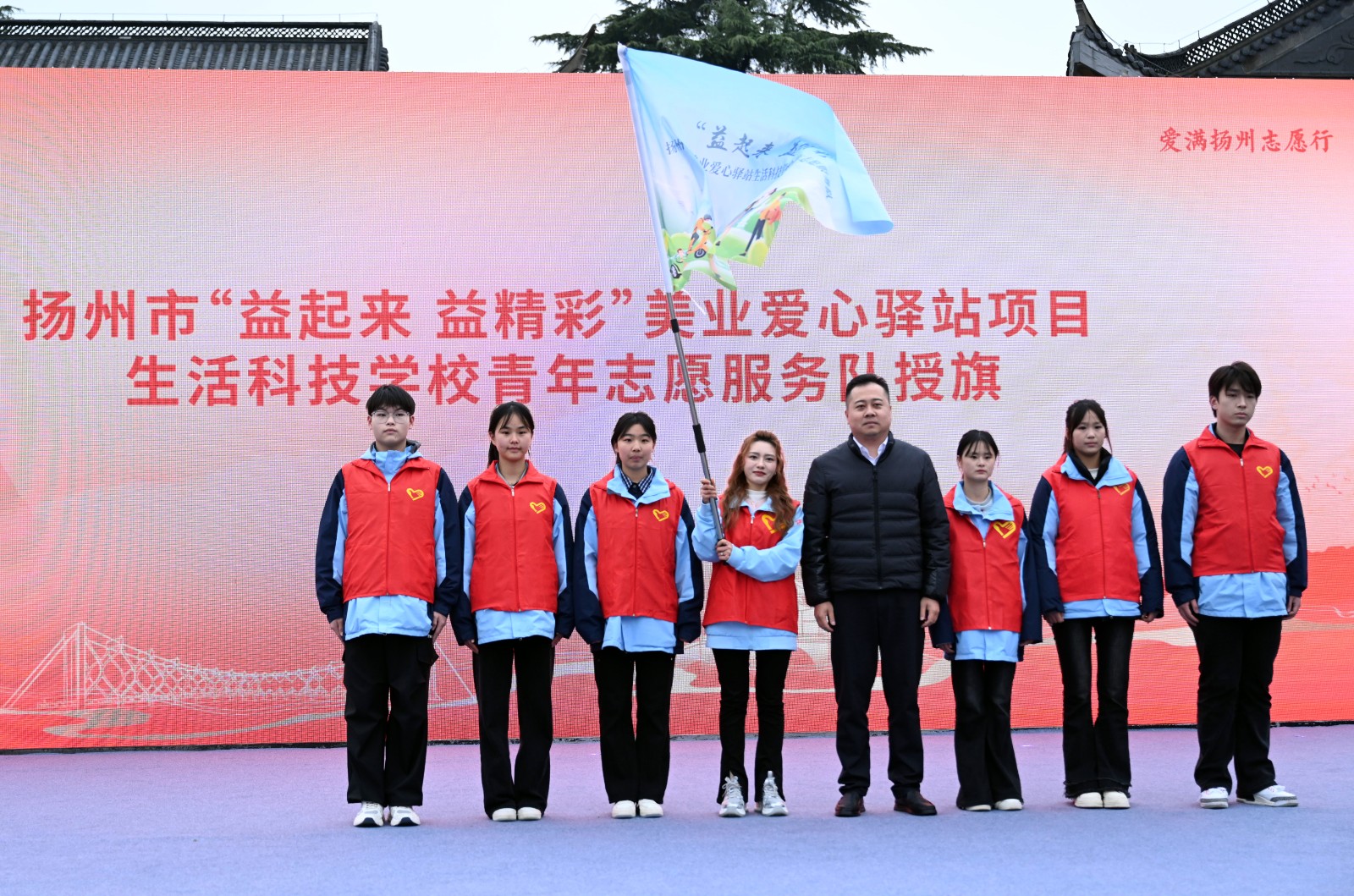 作为“益起来·益精彩”美业爱心驿站项目全国试点城市,扬州市积极挖掘城市特有的“三把刀”美业资源为项目赋能。由我校商贸旅游系美发与形象设计专业组建的青年志愿服务队,积极响应扬州市“益起来·益精彩”美业爱心驿站项目,在学生创业园实践基地常态化开展暖“新”义剪服务,并组建多支志愿服务分队在全年度特定时点主动提供上门义剪服务。活动现场,市委社会工作部部长、“两新”工委书记张其龙,市委宣传部副部长、市精神文明建设办公室主任吴军,亲切慰问师生,深入了解“益起来·益精彩”项目实践和学校的技能教学情况,市领导对学校在培养高素质技能人才方面所做的努力表示肯定,并鼓励学生们刻苦学习,勇于创新,为城市发展贡献力量。共青团扬州市委员会副书记杨国庆为美业爱心驿站我校青年志愿服务队授旗。