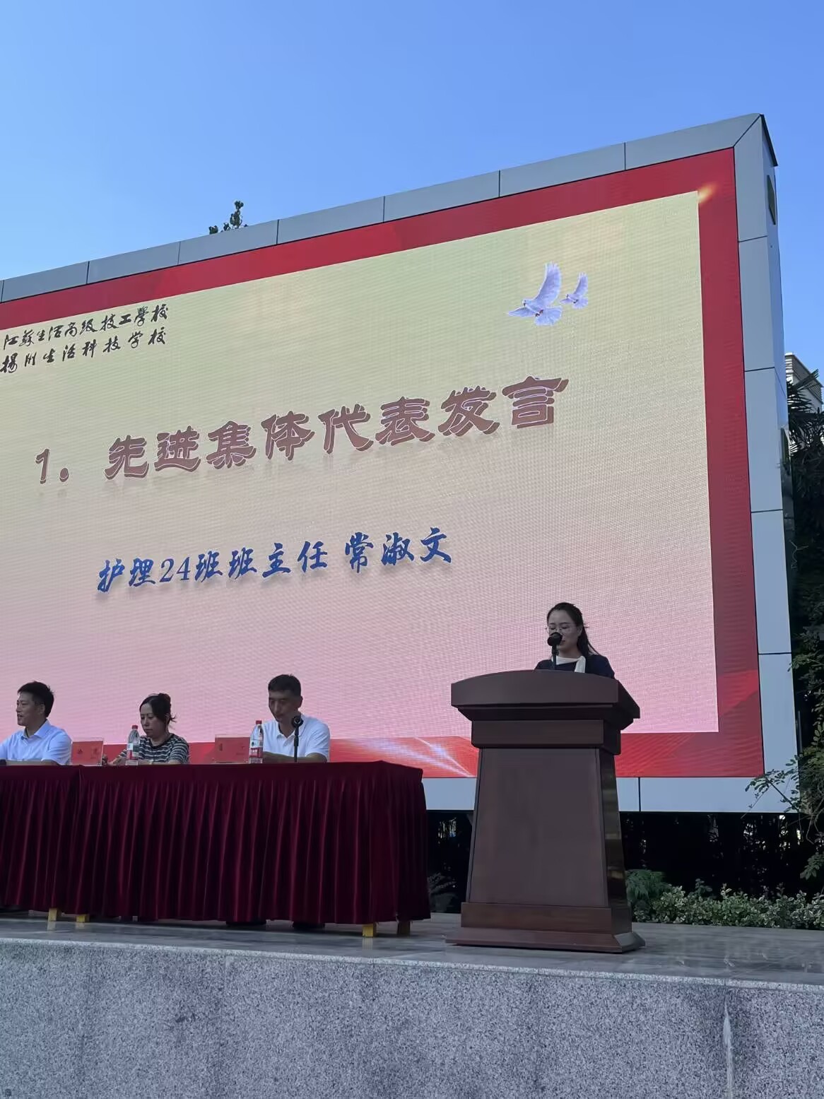 先进代表发言环节,护理24班班主任常淑文作为先进集体代表,分享了班级“四心”管理经验。她提到,班级以“爱心、热心、细心、真心”为核心,推行“人人有事做,事事有人管”的精细化管理,让每位同学都成为班级建设的参与者,再通过“一对一”学业帮扶计划营造浓厚学风,“优秀班级”的荣誉是26名同学共同奋斗的结果。紧接着,综合231班赵子悦作为先进个人代表发言,她结合自身连续荣获校级奖学金、省级才艺展示一等奖的经历,以及参与主持、舞蹈、志愿服务的实践故事,诠释了“全面发展”的意义,鼓励同学们以热爱为基、以坚持为翼,在青春赛道上跑出风采。