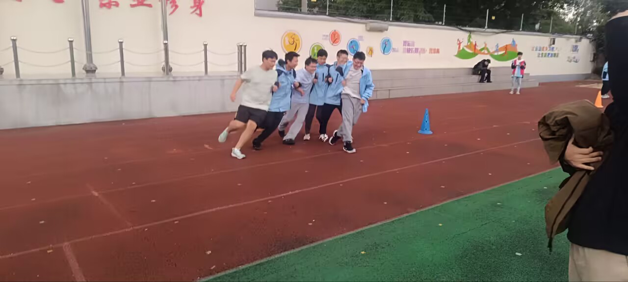 本次运动会打破传统竞技赛事的紧张氛围,以 “趣味优先、全员参与” 为核心,专为缓解新生学习压力、增进同学情谊而设计。“链接加速” 六人田径赛成为全场焦点 —— 各队队员前后相衔,双手搭肩化身 “小火车”,需在保持队形完整的前提下冲向终点,堪称默契与速度的双重考验。