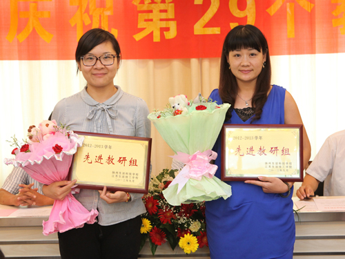 在欢快喜庆的音乐声中,校领导分别向获奖的先进集体和先进个人颁发了奖牌和荣誉证书。先进集体代表王永和先进个人代表顾荃老师先后进行发言。