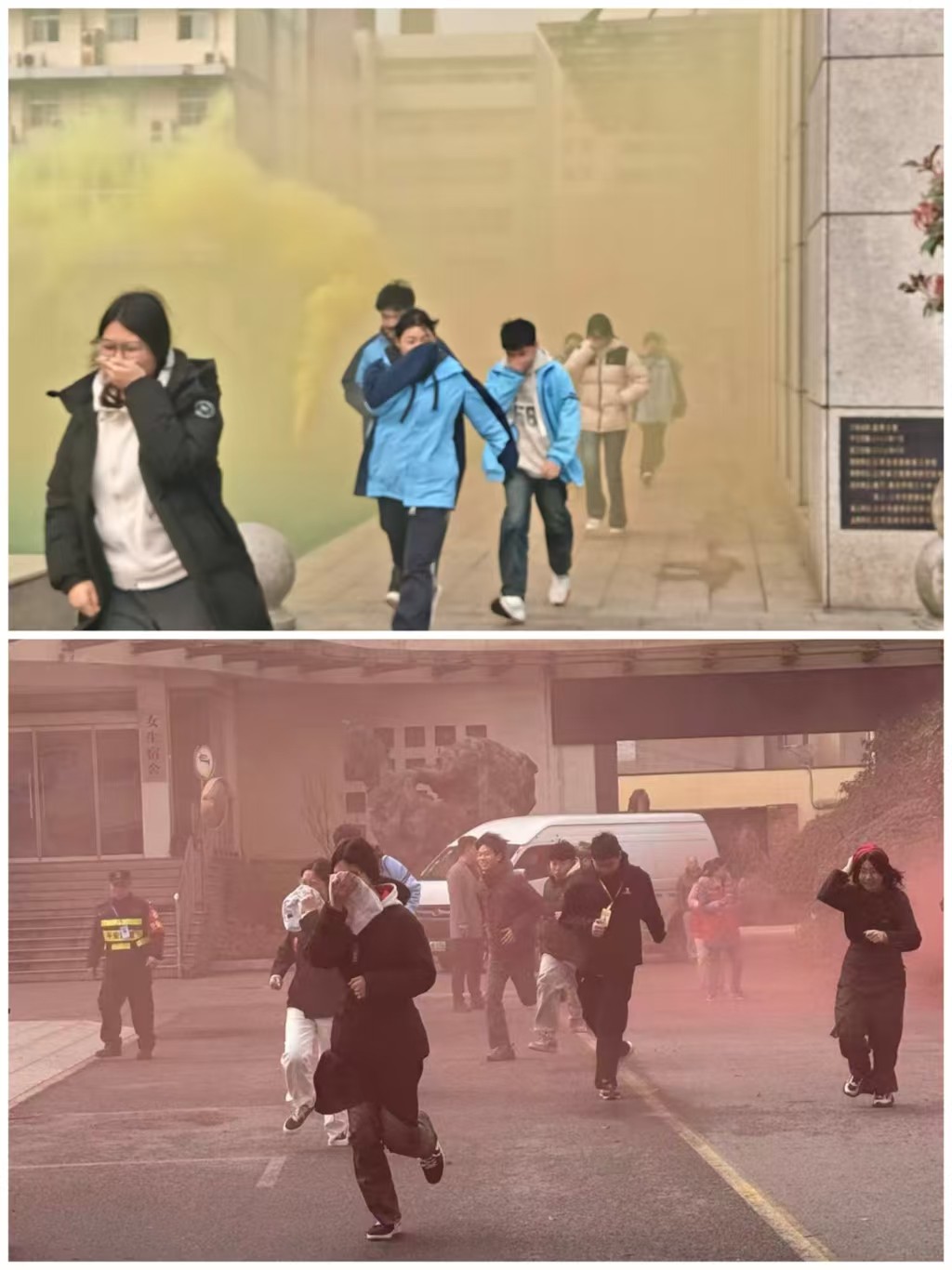 上午9时05分,随着校园消防警报骤然拉响,演练正式开始。现场利用烟雾道具营造出逼真的火灾氛围,浓烟迅速在校园弥漫,还原了视线受阻的危急场景。面对“险情”,任课教师立即引导学生捂住口鼻、低姿弯腰,沿预定路线有序撤离。尽管室外潮湿、室内“烟”雾缭绕,但在严密组织下,师生沉着冷静,无拥挤、推搡或滑倒现象。不到7分钟,全员安全抵达东操场并完成清点,过程井然有序。
