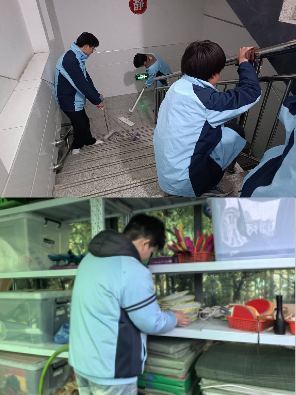 实训场地“焕新”行动:有的班级聚焦专业实训车间,开展环境整理与安全排查。大家按工具功能分区归置扳手、量具等器材,集中清理堆积的废料杂物,用抹布仔细擦拭设备表面的油污与灰尘,同时检查设备线路是否老化、安全防护设施是否完好,让实训场地既整洁有序,又安全合规。