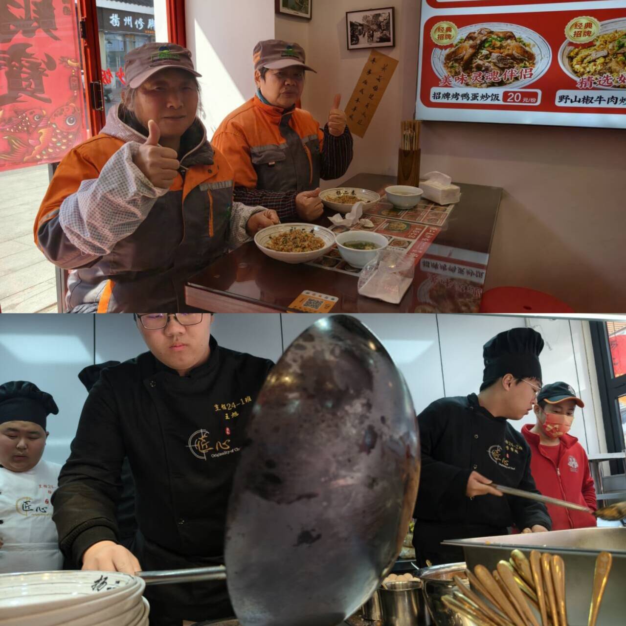 非遗炒饭“暖心”服务:烹饪241、242班学生与扬二春炒饭大东门店携手合作,师生共同参与非遗炒饭制作。同学们严格遵循非遗技艺流程,把控食材配比与火候,将一份份热气腾腾的炒饭装入保温盒,送到周边环卫工人手中。接过餐食时,环卫工人脸上的笑容,让春日的街头更添暖意。