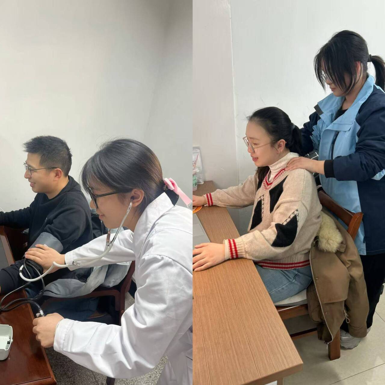公益保健“暖心”服务:还有班级在学校一楼大厅开展肩颈按摩服务,安排数名同学为师生提供专业放松护理。服务中,同学们轻柔按摩肩膀、胳膊,辅以头皮放松手法,帮助缓解师生因长期伏案学习、工作产生的肩颈疲劳,用贴心服务传递健康关怀。