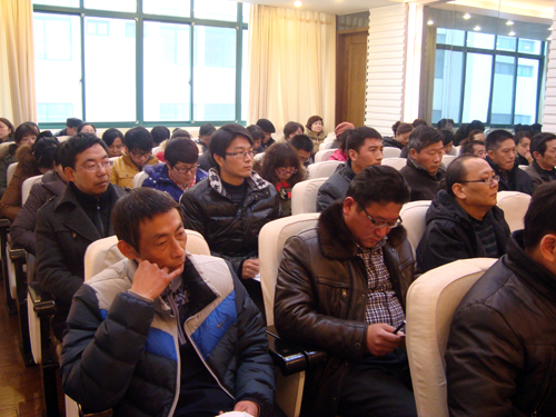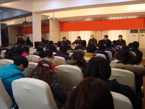 2014年1月13日下午,学校在四楼会议室召开教职工大会,校领导高洪树、李东岩、袁建中、聂阳、吴健出席会议,全体在编教职工参加了会议。