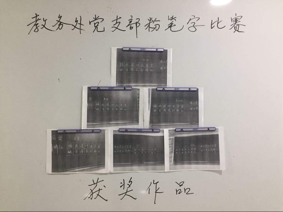 2017年11月30日教学党支部粉笔字比赛圆满落幕。参赛的各位党员教师在教学楼707教室进行了粉笔书法水平的现场比拼。经评委组对全部参赛作品进行仔细、全面地评鉴和比对,最终决出比赛结果如下: