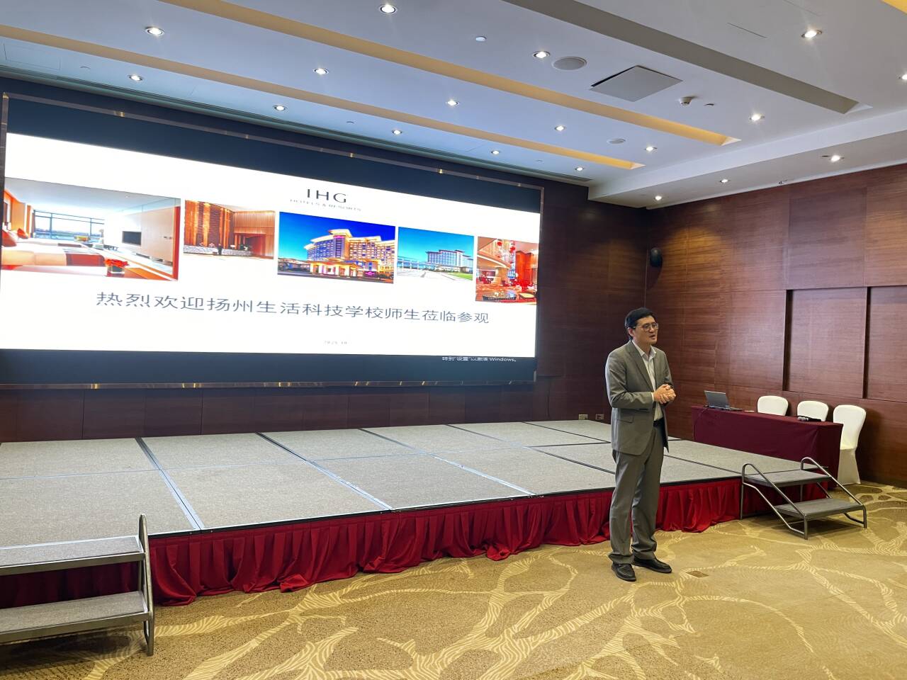 下午两点,研学活动正式拉开帷幕。扬州皇冠假日酒店总经理水泉涌对陈华金副主任一行的到来表示热烈欢迎,并以酒店发展为切入点,向同学们系统介绍了酒店的品牌定位、运营架构及餐饮板块的核心优势。他提到,扬州皇冠假日酒店作为当地高端酒店标杆,其餐饮团队不仅拥有多名资深主厨,更在淮扬菜创新、中西融合菜品研发等领域形成了独特竞争力,多次承接重要餐饮接待任务,在行业内拥有良好口碑。