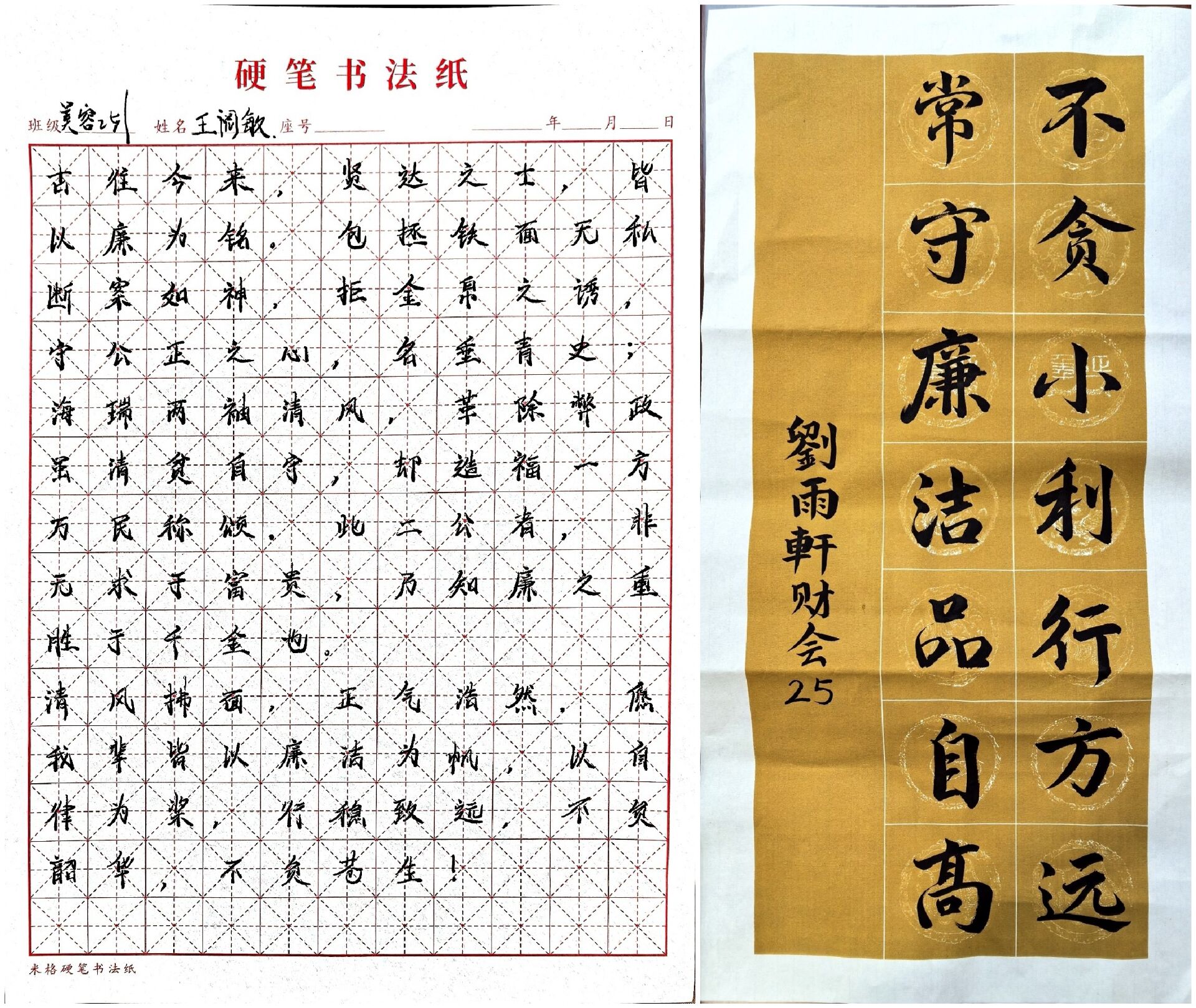 “廉政书法”比赛现场墨香盈室,秩序井然。赛事分软笔与硬笔两组进行,选手们全神贯注,点横撇捺间尽显功力。软笔组宣纸铺展,墨迹酣畅,一幅幅作品或苍劲有力,或清秀飘逸;硬笔组亦笔走规整,结构严谨,于方寸格间书写清廉正气。同学们将对“廉政”主题的理解融入字里行间,既展现出扎实的书法技艺,也体现了对廉洁文化的深刻体悟。