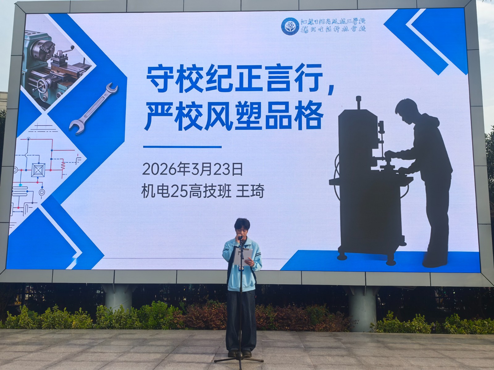 王琦同学演讲结束后,张海震书记作总结讲话。他强调,校纪校规是校园秩序的基石、学生成长的“护航灯”,校风学风是学校精神的体现、品格养成的“孵化器”,纪律从不是冰冷条文,而是对同学们的保护与期待,既是保障安全的底线,更是助力成长的阶梯,作为技术技能人才,品德与技能缺一不可。他结合学校文明礼貌月活动,号召全体学生从点滴小事做起,严守中职生行为准则,在网络空间坚守道德法律底线,积极争创文明班级、文明宿舍、文明学生标兵,并以“纪律是成长的基石而非枷锁,校风是集体的名片,人人皆是设计师,品格是人生的通行证,今日选择决定明天高度”三句话与同学们共勉,鼓励大家以校纪为标尺、以文明为准则,用规范言行书写精彩人生。