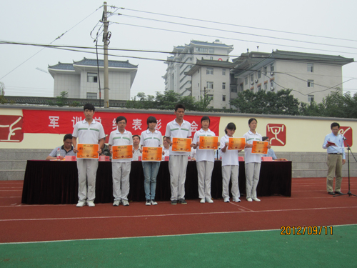 接着袁建中副校长,宣读了对军训先进班级、先进班主任、会操优胜班级、和内务整理先进宿舍的表彰决定,他希望受表彰的先进个人和集体,继续努力争取更大的进步,伴随着激昂的乐曲,先进个人和集体代表走上主席台领取了自己的荣誉证书。