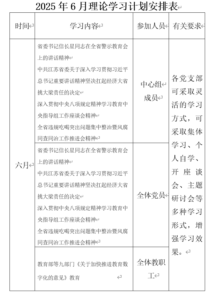 现把2025年6月理论学习计划下发给你们,请各支部按照计划并组织学习。理论学习坚持做到有计划、有记录、有考勤、有报道。学校将适时对各支部学习情况进行检查。