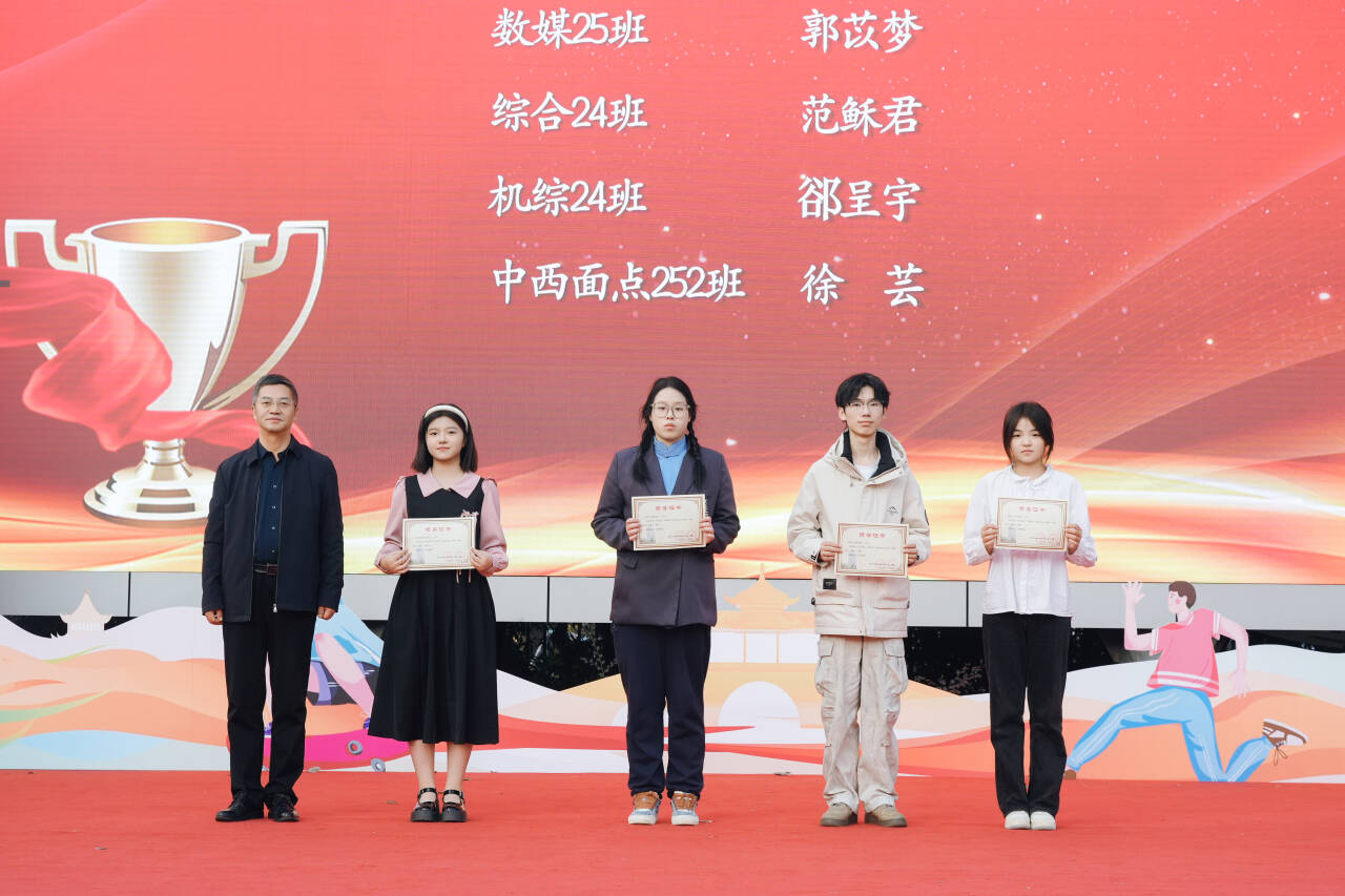 在随后第四届“声动校园,筑梦青春”校园主持人大赛颁奖环节中,经过前期稿件撰写、即兴表达、舞台控场等多轮层层选拔与激烈角逐,一批兼具语言功底与台风魅力的优秀学子脱颖而出。章书记、聂校长、陈校长分别为一、二、三等奖获奖选手颁奖,见证荣耀时刻。