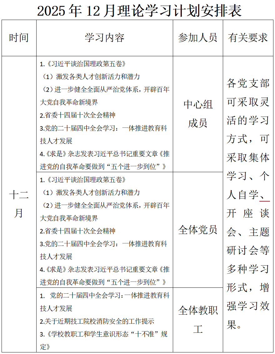 现把2025年12月理论学习计划下发给你们,请各支部按照计划并组织学习。理论学习坚持做到有计划、有记录、有考勤、有报道。学校将适时对各支部学习情况进行检查。