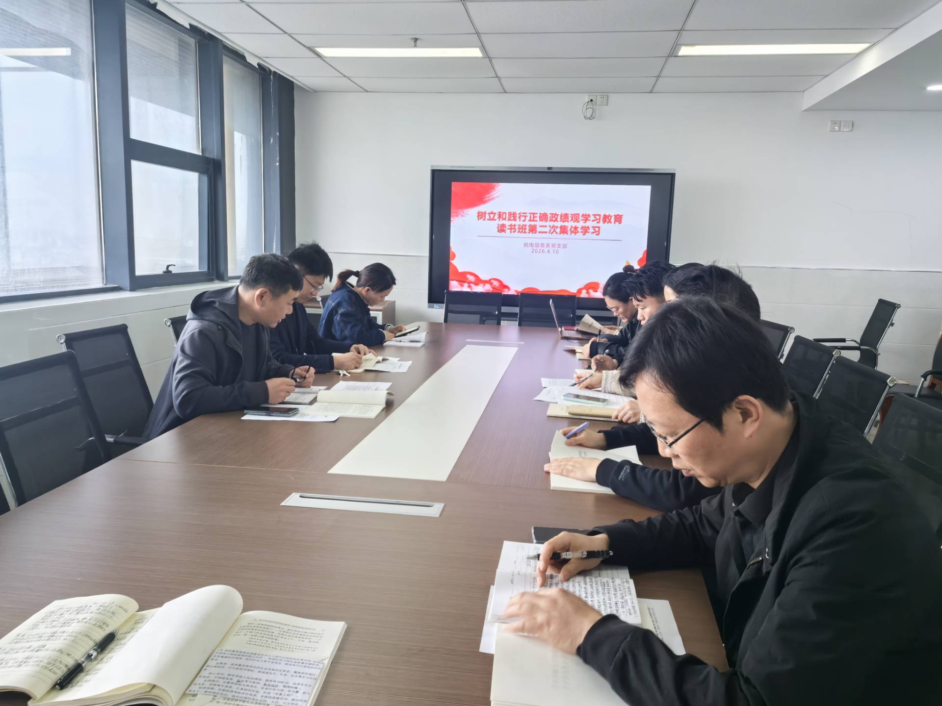 4月10日,机电信息系党支部组织开展了树立和践行正确政绩观学习教育读书班第二次学习活动,通过领学原著、专题研讨、交流发言等形式,系统学习《习近平关于树立和践行正确政绩观论述摘编》,并结合工作实际展开深入研讨。支部全体党员参加学习,支部书记张海震主持会议。