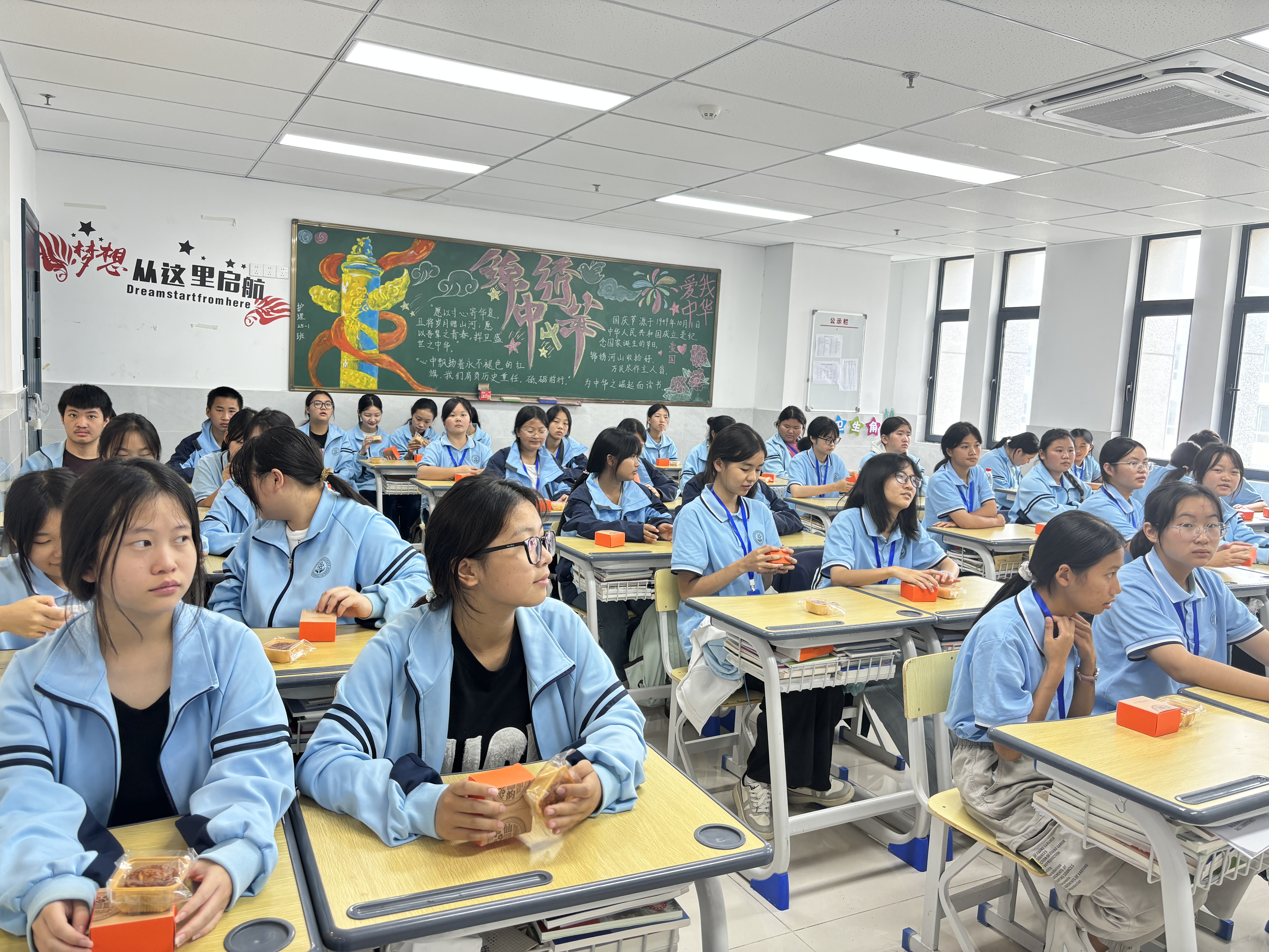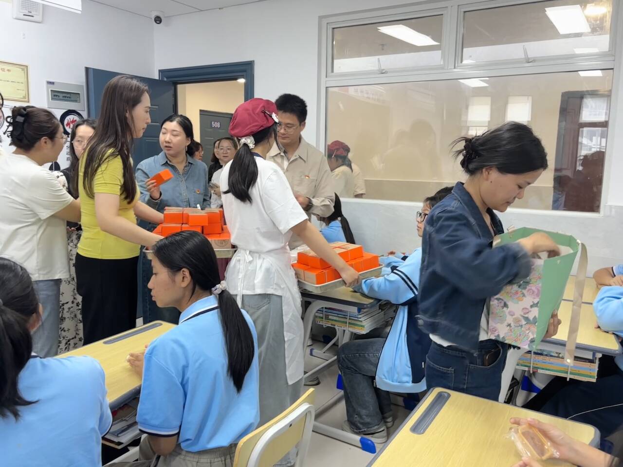 当天上午,陆主任带领师生代表准时来到指定教室。她先站在讲台上发表暖心讲话,语气温和却充满力量:“怀化、石家庄的同学们跨越山海来到这里求学,中秋虽不能与家人围坐团圆,但烹饪管理系的师生就是你们的‘校园家人’。这份月饼里藏着我们的祝福,希望能让大家感受到家一般的温暖。” 讲话结束后,师生们逐一将月饼礼盒递到学子手中,每一份传递都伴着真诚的节日问候。