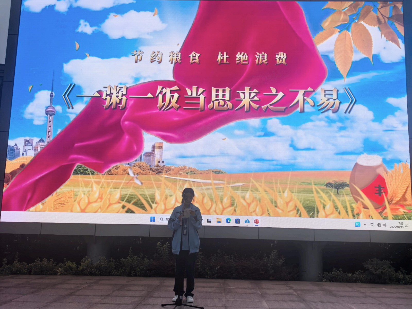 演讲结束后,陈主任进行了总结。他引用“一粥一饭,当思来之不易”的古训,强调珍惜粮食不仅是节约行为,更是传承千年的民族美德。随后,他向全体师生提出三点希望:争做“光盘行动”践行者,就餐时按需取餐、杜绝剩菜;争做“节约风尚”引领者,在校园、家庭、社会中主动维护节约美德;争做“爱粮节粮”宣传者,向身边人传递节约理念。他呼吁大家从每一餐做起,让节约成为习惯,让美德照亮校园。
