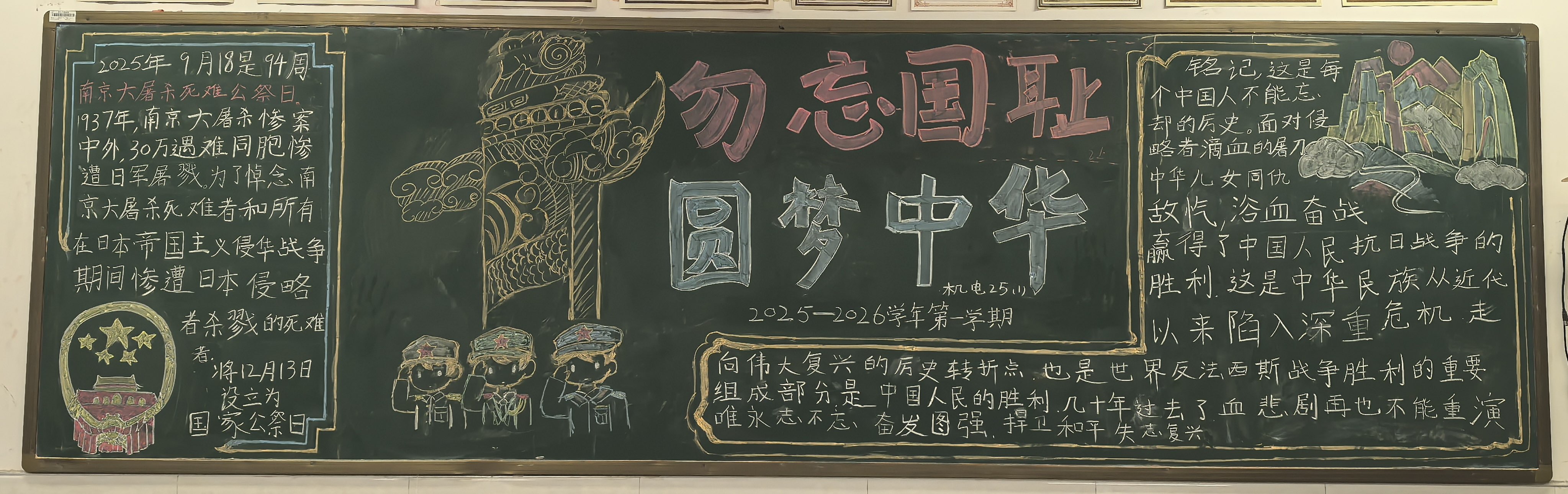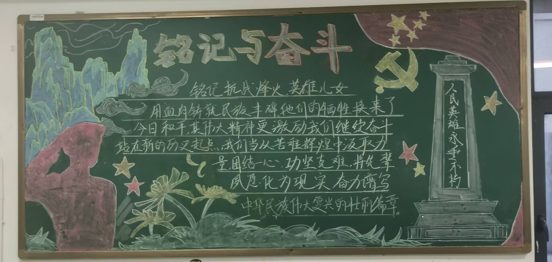 自活动启动以来,机电信息系将此次板报评选活动作为加强学生爱国主义教育、传承红色基因的重要载体。各班级积极行动,师生们共同围绕“铭记・奋斗”主题展开创意构思。在创作过程中,同学们广泛搜集革命历史资料、抗战英雄事迹以及新时代奋斗故事,确保板报内容准确翔实、富有深度;同时,在版面设计上大胆创新,巧妙运用色彩搭配、图文结合、立体造型等多种表现形式,将红色元素与班级特色相融合,使每一块板报既主题鲜明突出,又兼具美观性与教育意义。各班师生用画笔和文字勾勒出革命先烈的壮志豪情,书写出新时代青年的奋斗决心,让每一块板报都成为了一堂生动的“爱国主义教育课”。