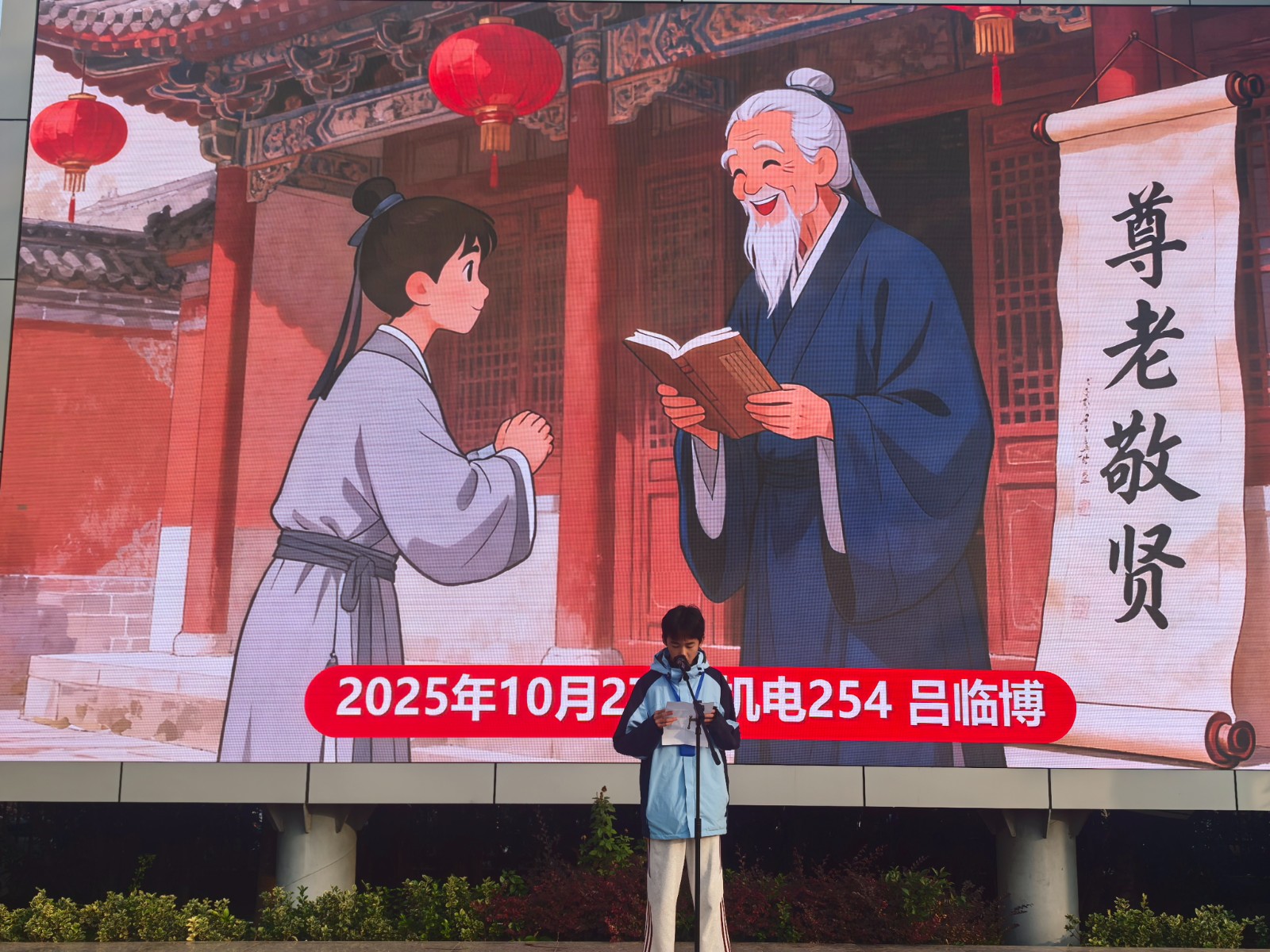 升国旗仪式后,吕临博同学以“尊老敬贤”为核心展开演讲。他结合“老吾老以及人之老”的经典论述,阐释了尊老不仅是孝敬自家长辈,更要推己及人尊重社会长者的深刻内涵,号召同学们从公交车让座、耐心倾听长辈话语等小事践行尊老美德;同时点明“贤”的时代内涵,鼓励大家以行业工匠、优秀学长和师长为榜样,在实训课堂中精进技能,以敬畏之心对待专业,用实际行动致敬贤者。