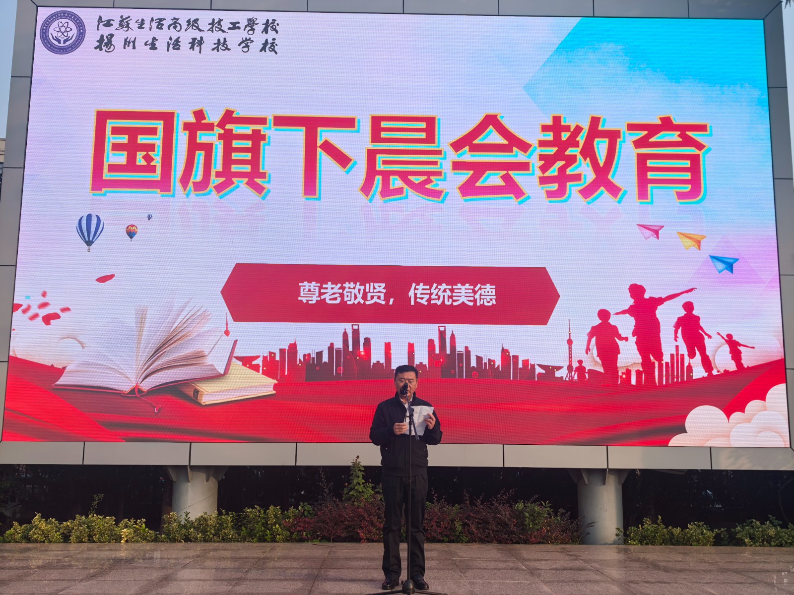 2025年10月27日,阳光洒满校园,我校全体师生齐聚操场,在庄严的国旗下开展了以《敬老尊贤・传承美德》为主题的晨会教育活动。本次活动由机电信息系党支部书记张海震主持,机电信息系机电25-4班学生吕临博发表主题演讲,师生共同浸润文明礼仪的深厚底蕴,感悟传统美德的时代意义。