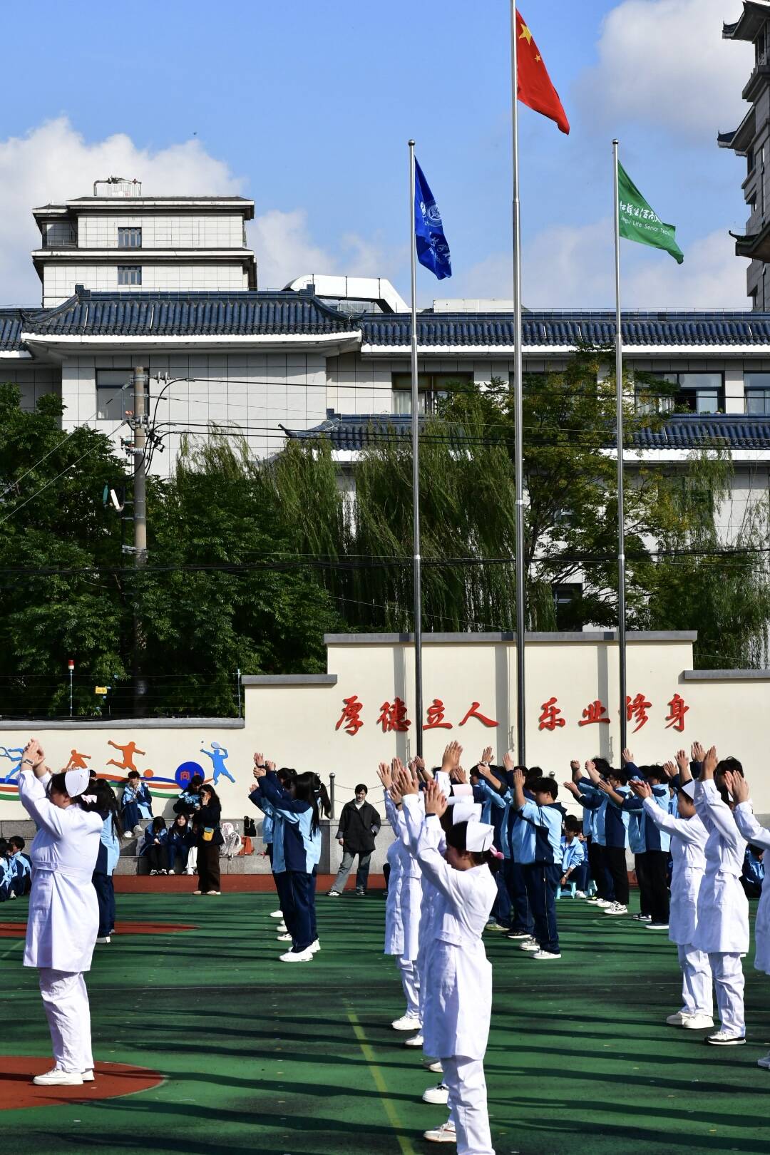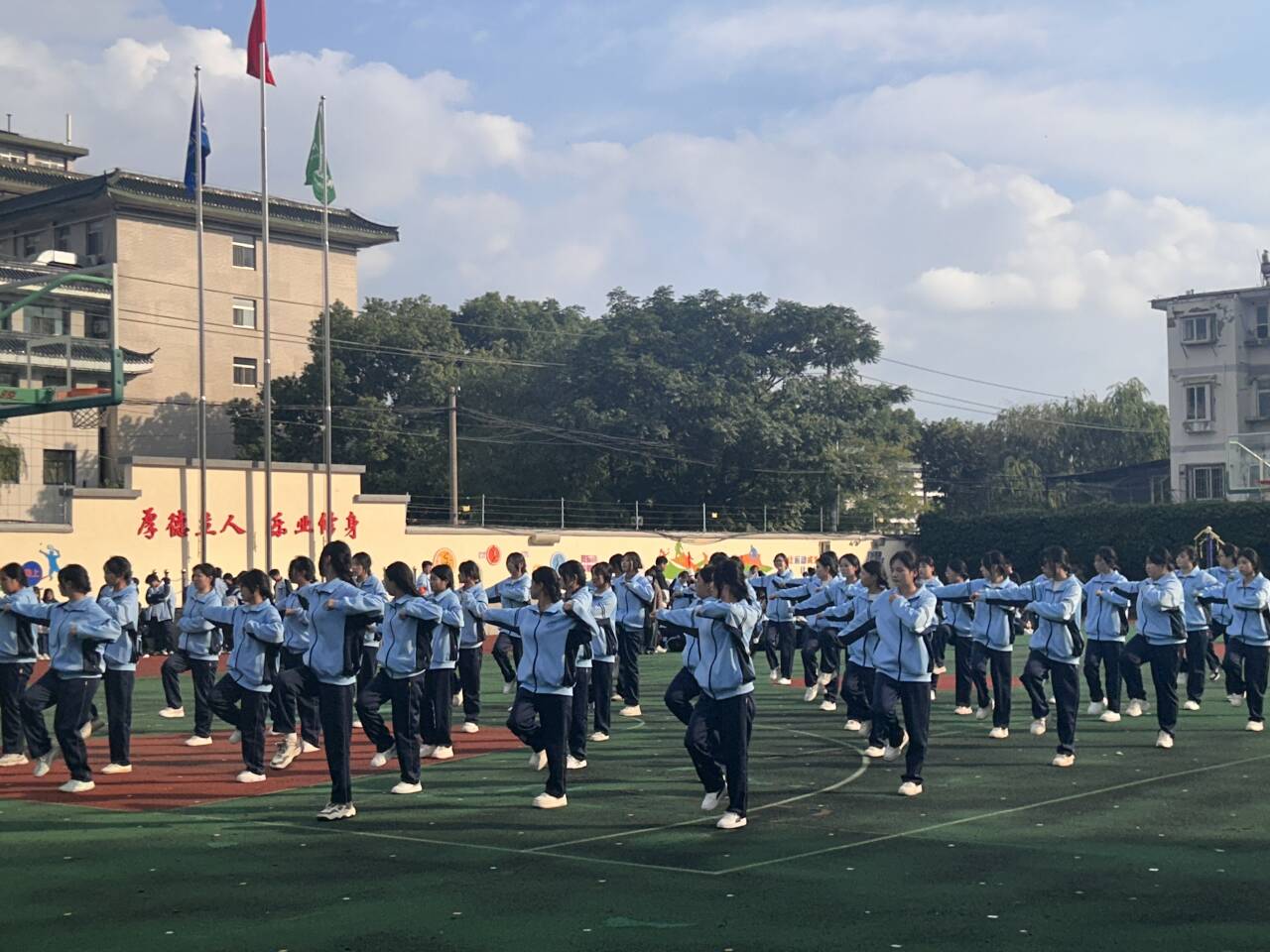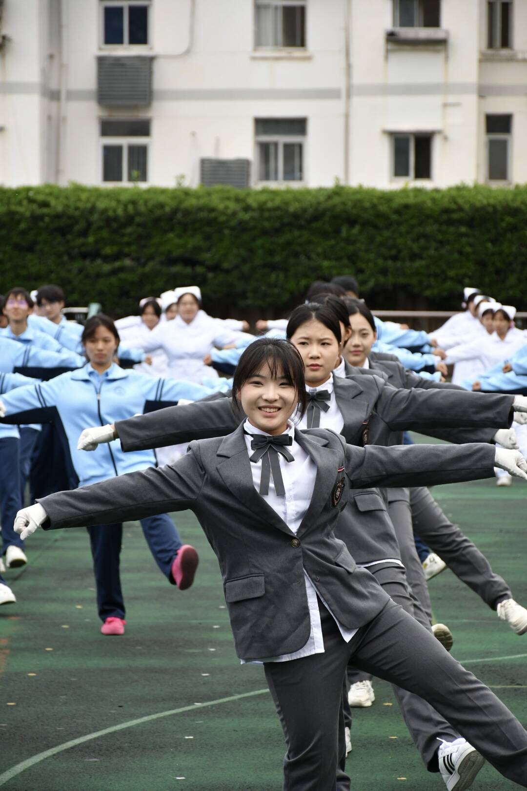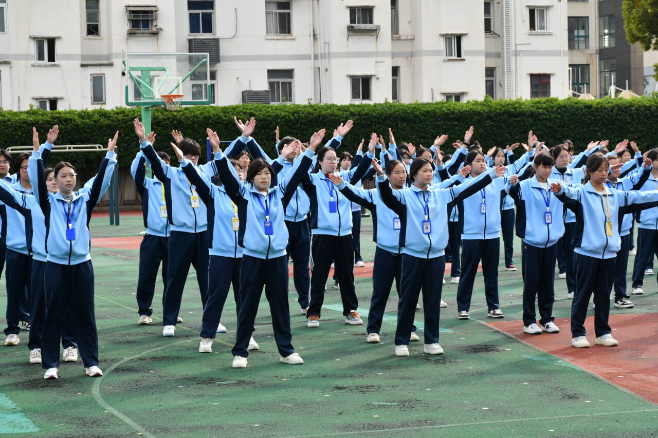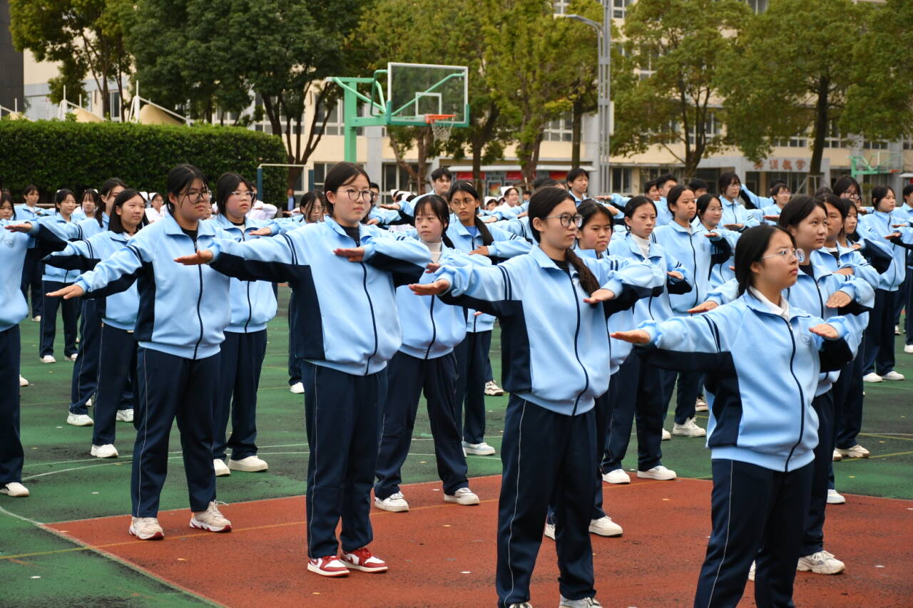 随着音乐的响起,挺拔的身姿与专注的神情交织出自信的光彩。广播操的节奏跃动在操场的每一个角落,动作整齐划一、干净利落——伸展时的稳健,弯腰时的从容,跳跃时的轻盈,构成了一幅活力四溢的青春画面。每一个动作都凝聚着专注与努力,每一次呼吸都与音乐同频。