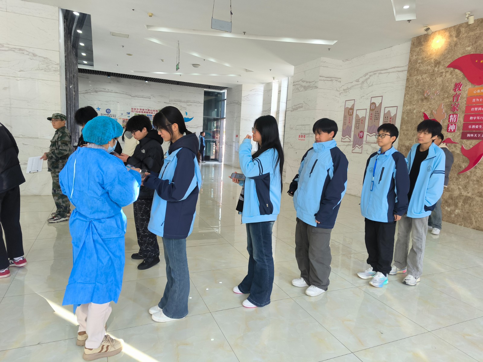 11月11日上午,现场筛查工作在教学综合楼一楼大厅进行,医护人员严格按照规范流程,依次完成信息核对、结核菌素试验(PPD试验)等环节。分管校领导和总务处相关人员到现场指挥,耐心引导新生有序排队、登记信息、种后留观,医务室人员解答同学们关于筛查项目、结果查询及结核病预防的疑问。同学们积极配合,自觉遵守现场秩序,整个筛查过程高效顺畅、井然有序。