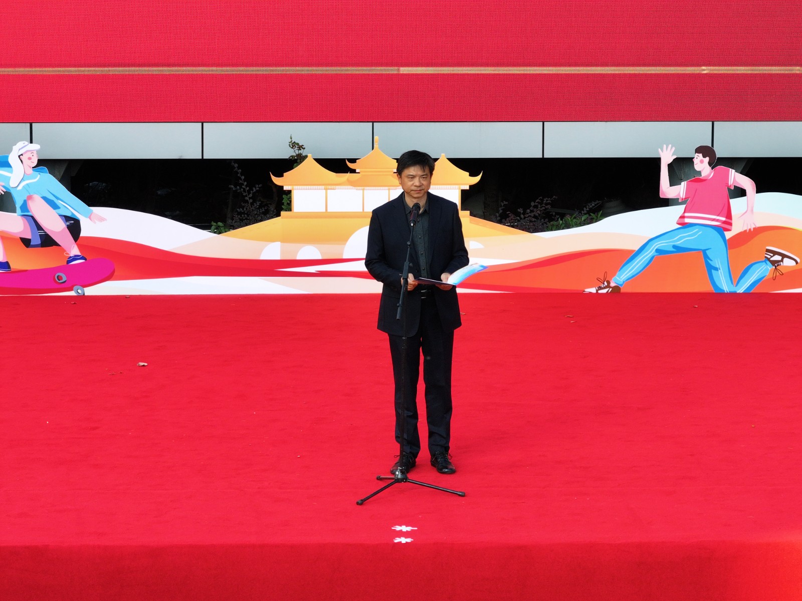 随后,聂校长发表致辞。他代表学校向筹备文化节的师生致以敬意,向参与活动的同学表示欢迎,校园文化节是践行“五育并举”、落实立德树人的生动课堂,也是学子展示才华的舞台。围绕活动主题,他介绍了“传薪・铸魂”“传道・启智”“传健·强体”“传艺·蕴美”“传志·力行”等五大系列篇章,鼓励同学们从文化观赏者转变为参与者、创造者,在交流中收获成长。