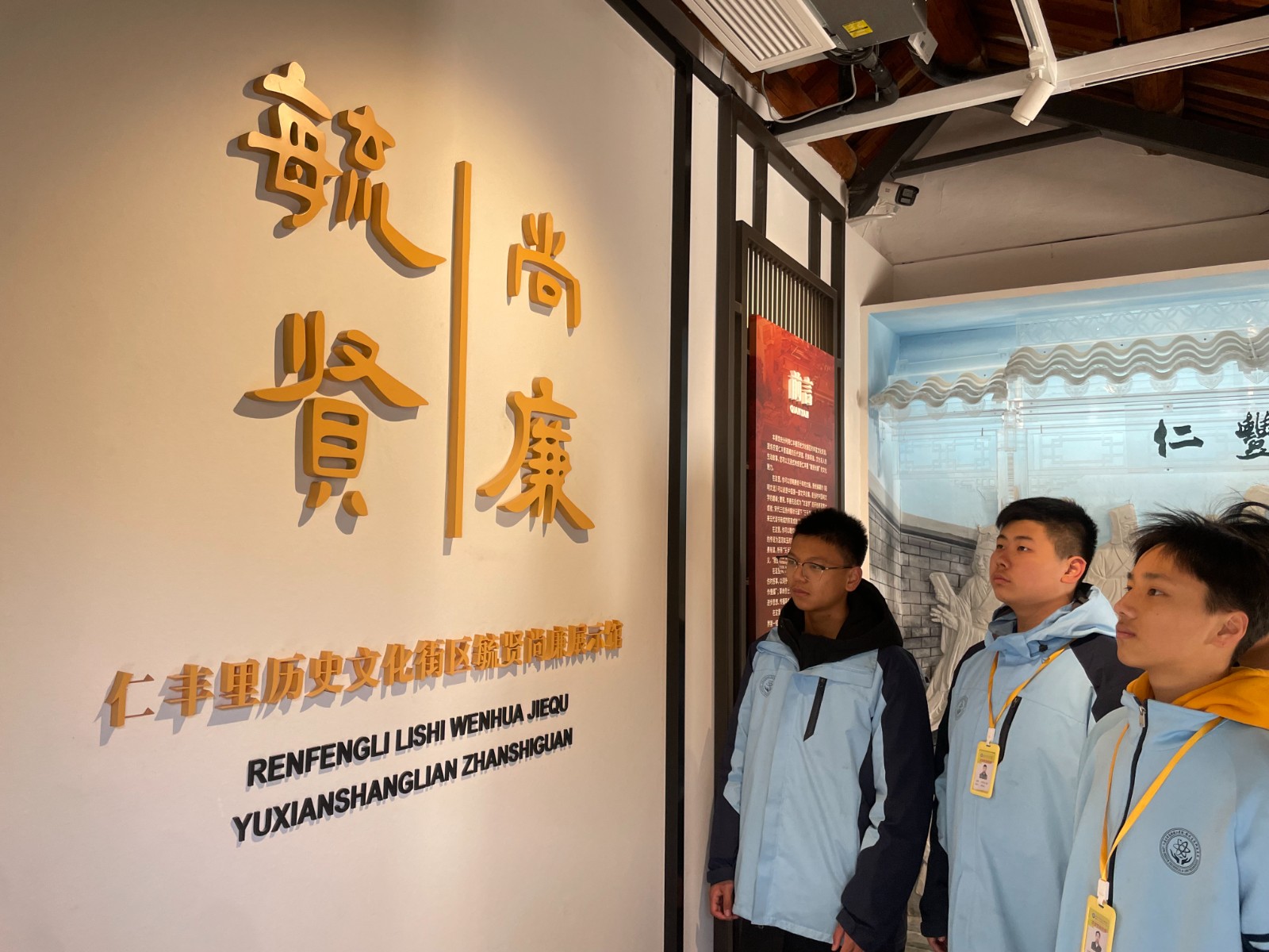 仁丰里作为扬州古城保存最完整的历史街区之一,承载着千年文脉与城市记忆,而街区内的历代名人崇文馆更是集历史展示、文化传播与廉政教育于一体的重要阵地。活动当天,师生们沿着青石板路漫步街区,两侧古色古香的民居、错落有致的巷弄,让大家直观感受了扬州深厚的历史底蕴与人文气息。在讲解员的引导下,同学们先后参观了崇文馆内的历代名人展区、廉政文化长廊等板块,详细了解了扬州历史上文人墨客、清官廉吏的生平事迹与廉政故事。从 “四知拒金” 的杨震到 “一钱太守” 刘宠,从扬州历代贤官的治政理念到当代廉政建设的丰硕成果,一幅幅图文并茂的展板、一件件承载记忆的实物,生动诠释了 “廉洁自律、勤政为民” 的深刻内涵,让同学们在潜移默化中接受了廉政文化的熏陶。