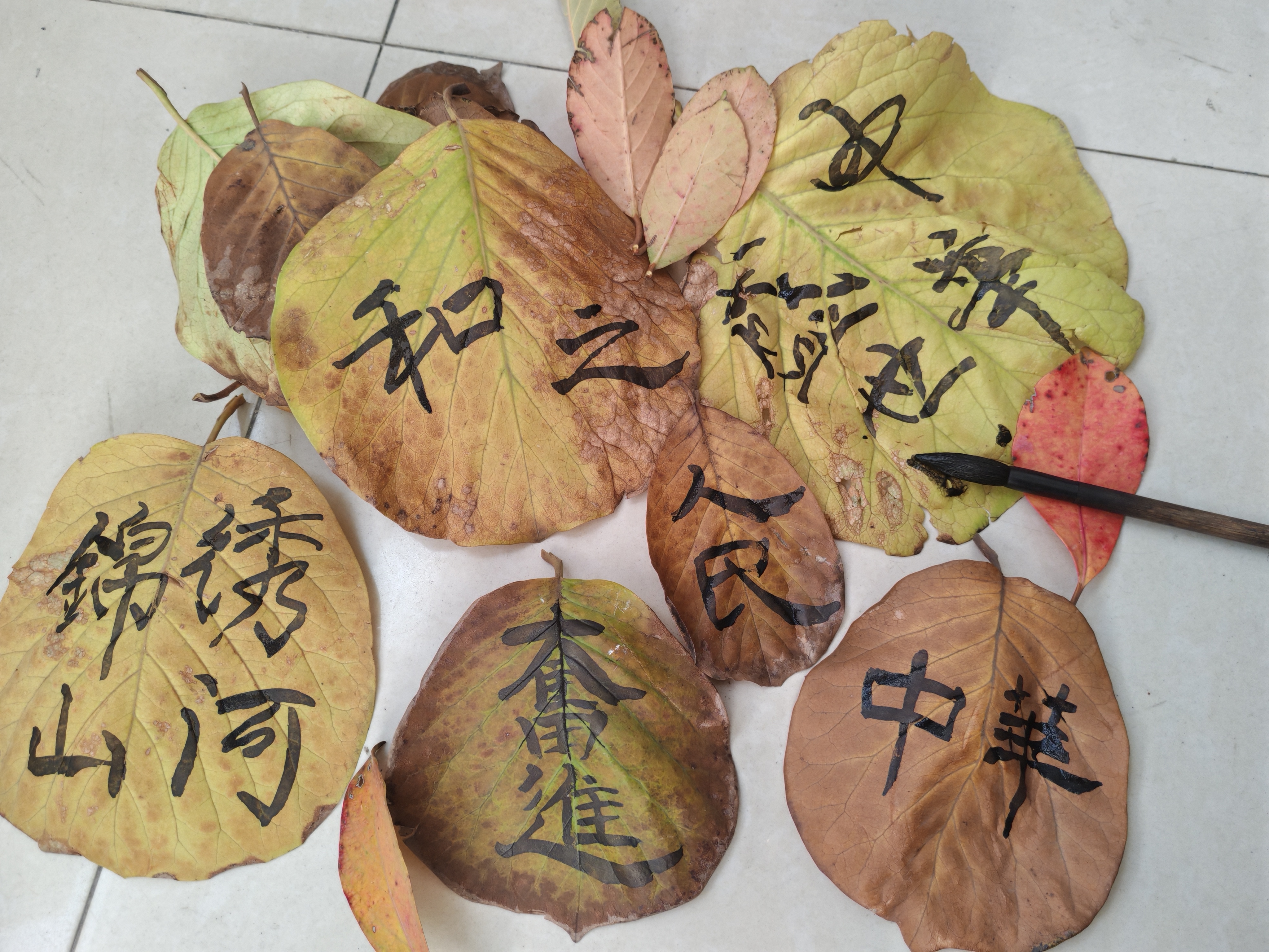 活动现场,百余枚“叶笺”铺展如画。篆书的古雅庄重、行书的飘逸灵动、楷书的端方清峻,与树叶天然的形态肌理相映成趣。一枚银杏叶上,“中华”二字如振翅之蝶;黄叶片片,“奋进”墨迹似血脉奔涌。同学们在创作中巧妙融入“十五五”规划关键词与时代金句,让传统书法艺术焕发出鲜明的时代气息。