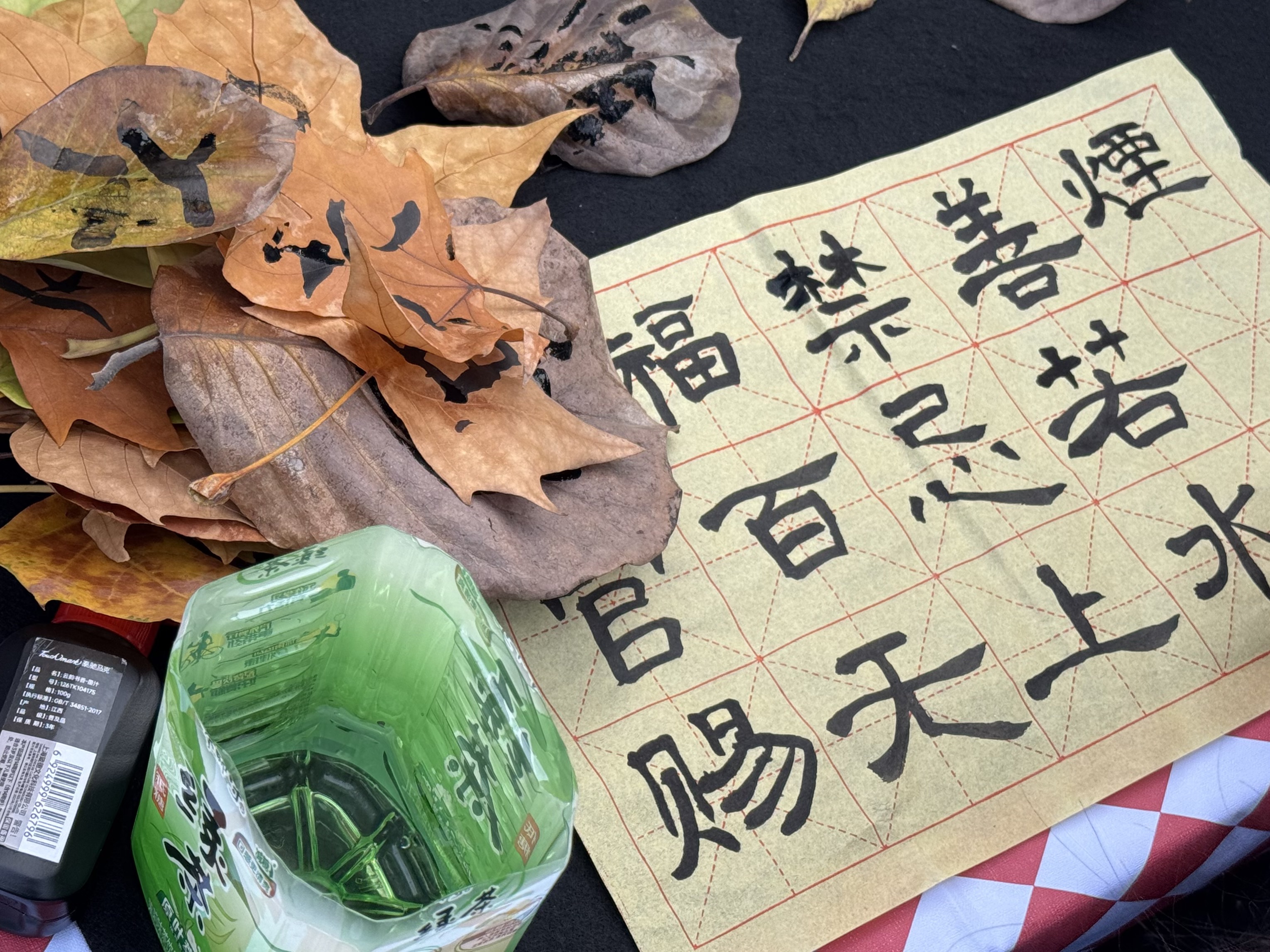 “在落叶上书写,让我感受到个体生命与宏大时代的共鸣。”社团同学手持作品说道,“叶会归根,而青春的理想将永远向阳生长。”活动不仅展现了中华美学的“道法自然”,更以润物无声的方式,引导青年学子在文艺创作中深化对国家未来发展的理解与认同。
