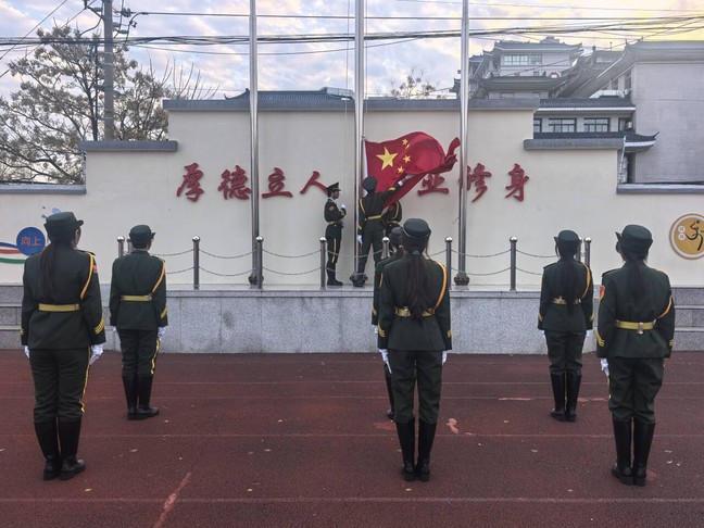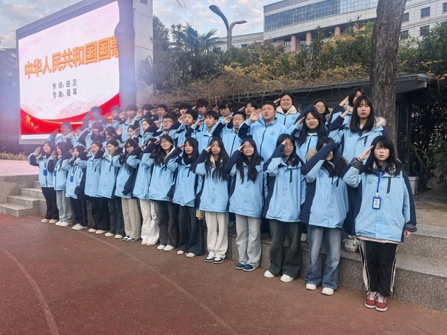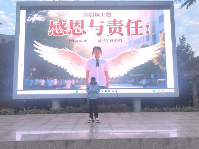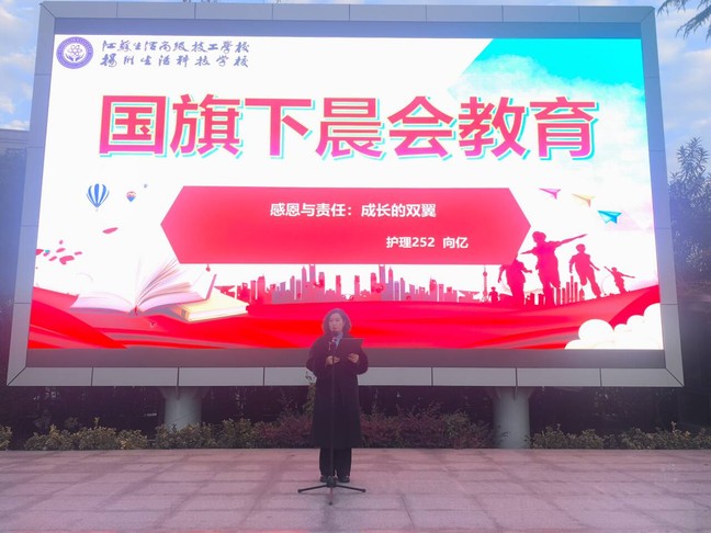伴随着雄壮的《义勇军进行曲》,国旗护卫队迈着铿锵有力的步伐入场,五星红旗冉冉升起,全体师生肃立注目,浓浓的爱国情怀在晨光中悄然涌动。随后,商贸旅游系护理25-2班的向亿同学作为学生代表登台发言。他分享了自己作为“2025级湖南怀化励志班”学子的求学经历:跨越千里来到扬州,学校免除学杂费、住宿费等各项费用,按月发放生活补助,彻底打消了同学们的求学顾虑;班主任的课余谈心、专业课老师的耐心答疑、系部的贴心帮扶,让初来乍到、因方言与生活习惯差异感到孤独的同学们,逐渐在校园里找到归属感,安心投入学习。作为护理专业学生,向亿同学深知未来守护生命的神圣使命,他代表班级庄严承诺,将把学校与老师的关爱化为奋进之力,以扎实的专业技能服务社会,用赤诚之心回报祖国与母校的培育。