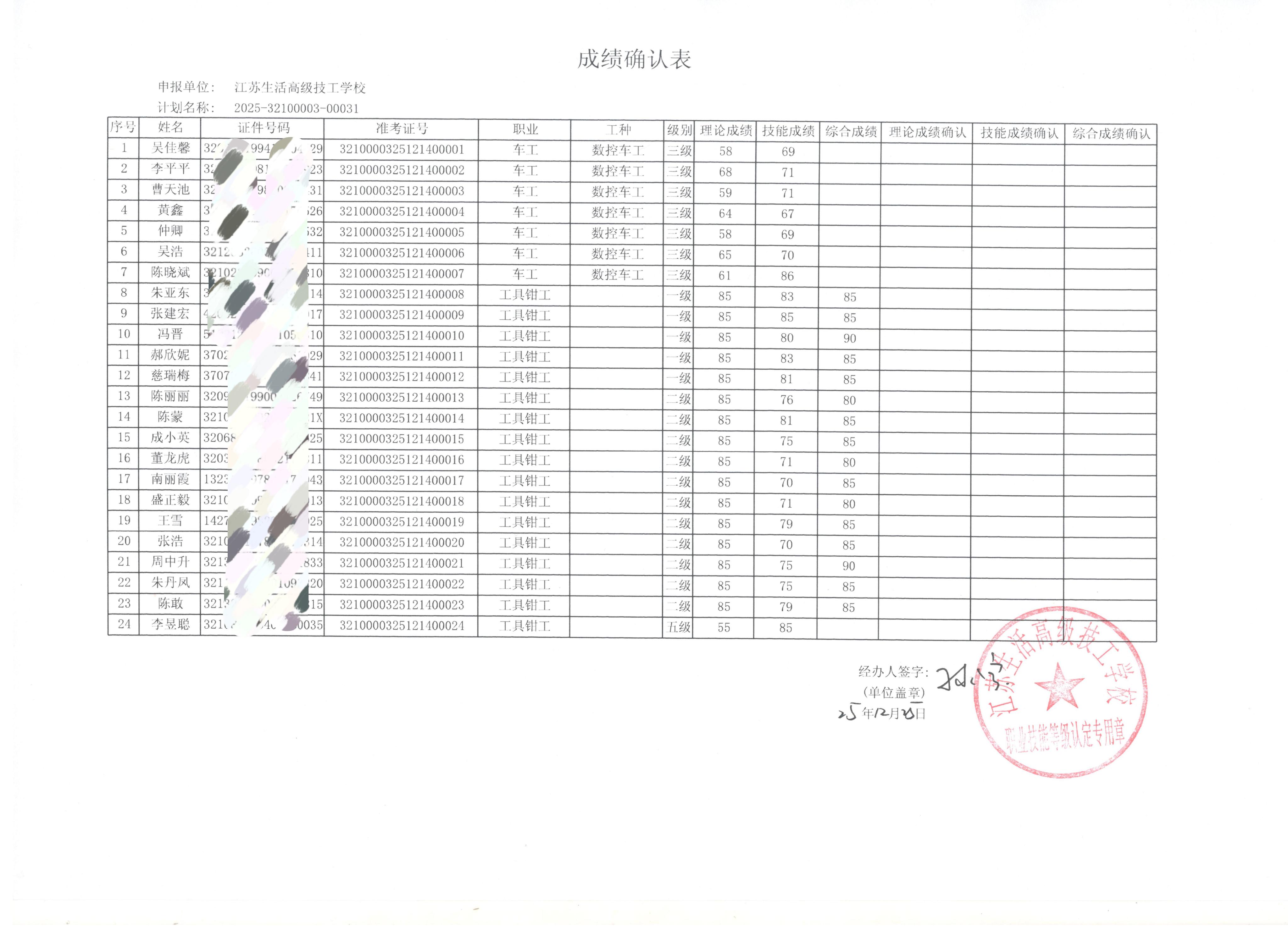 职业技能等级认定 车工3级钳工125级2025-32100003-00031 批次成绩公示