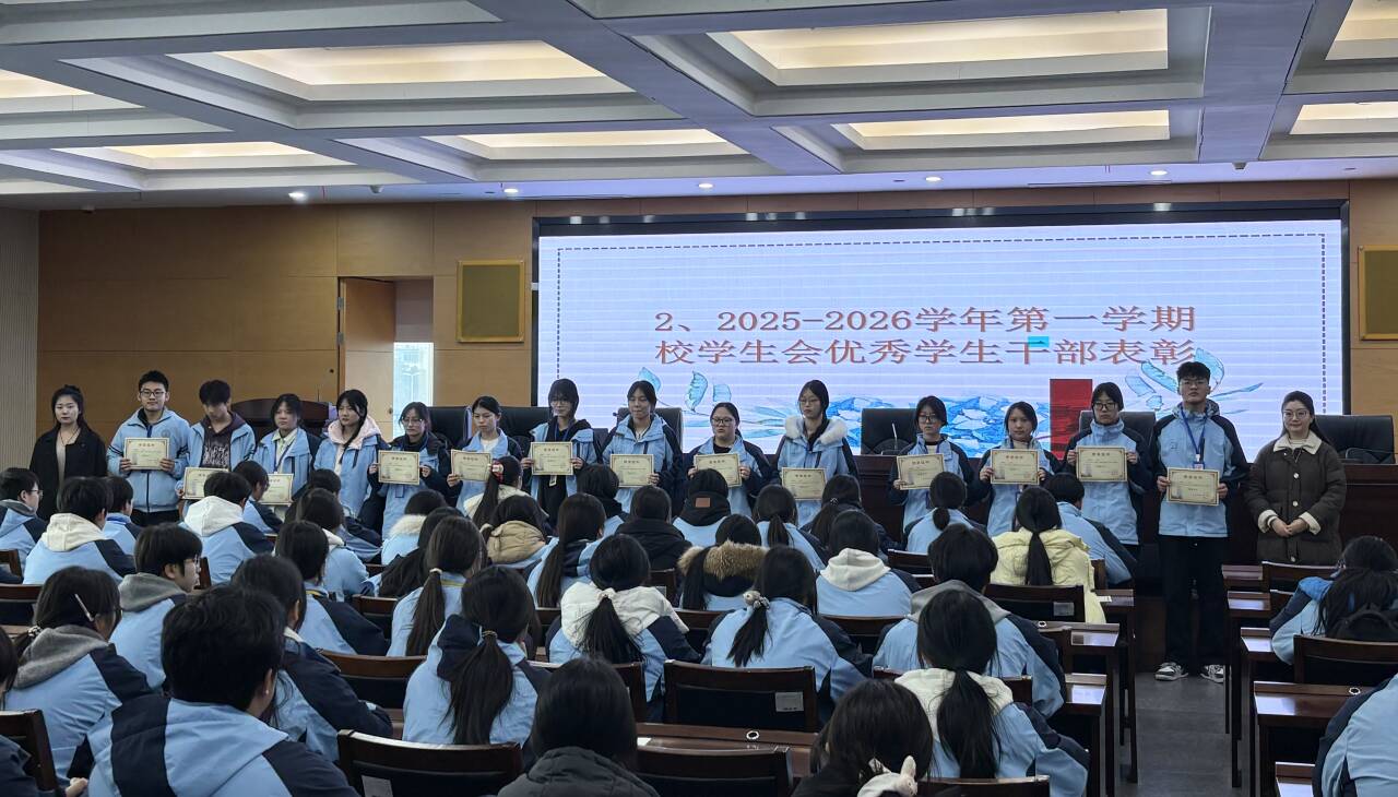 为总结学期工作成果,表彰优秀学生骨干,凝聚青春奋进力量,近日,我校2025-2026学年第一学期校学生会表彰大会圆满落幕。全体校学生会成员参会,团委副书记于晴出席大会并讲话。