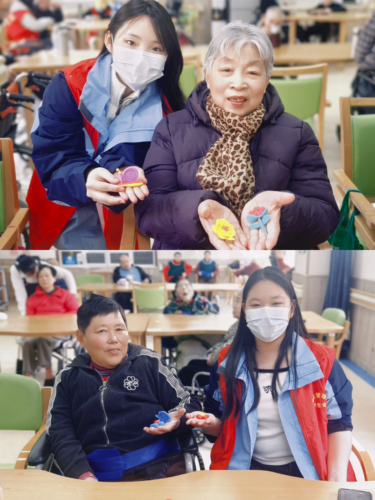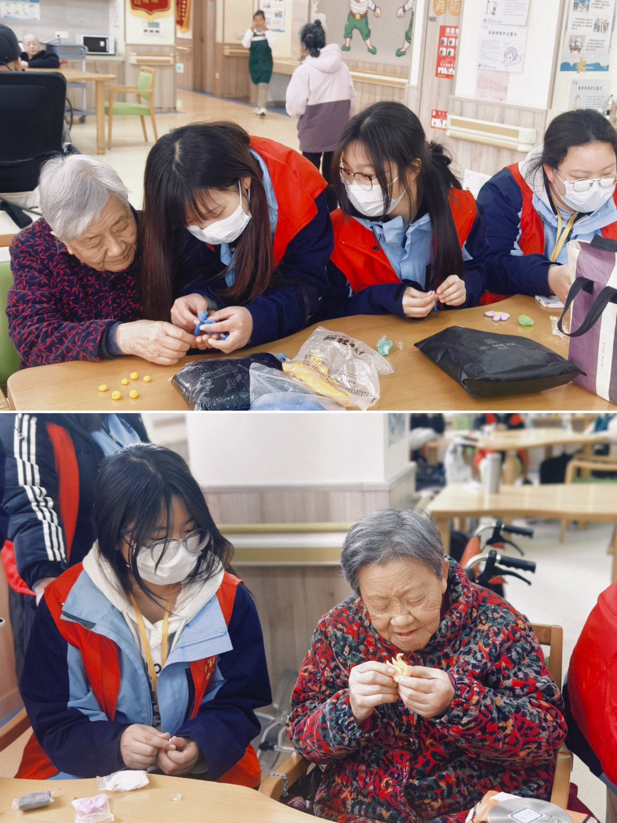 结合面点专业特色,志愿者们带来了非遗面塑与手工粘土体验活动。同学们现场示范揉、捏、压、刻等基础手法,手把手指导老人制作简单可爱的面塑造型、花卉图案和创意粘土小摆件。面对初次尝试的老人,志愿者们耐心讲解、细心辅助,鼓励大家大胆创作。老人们兴致盎然,认真投入,一件件小巧精致、充满童趣的作品陆续诞生,脸上洋溢着幸福满足的笑容。