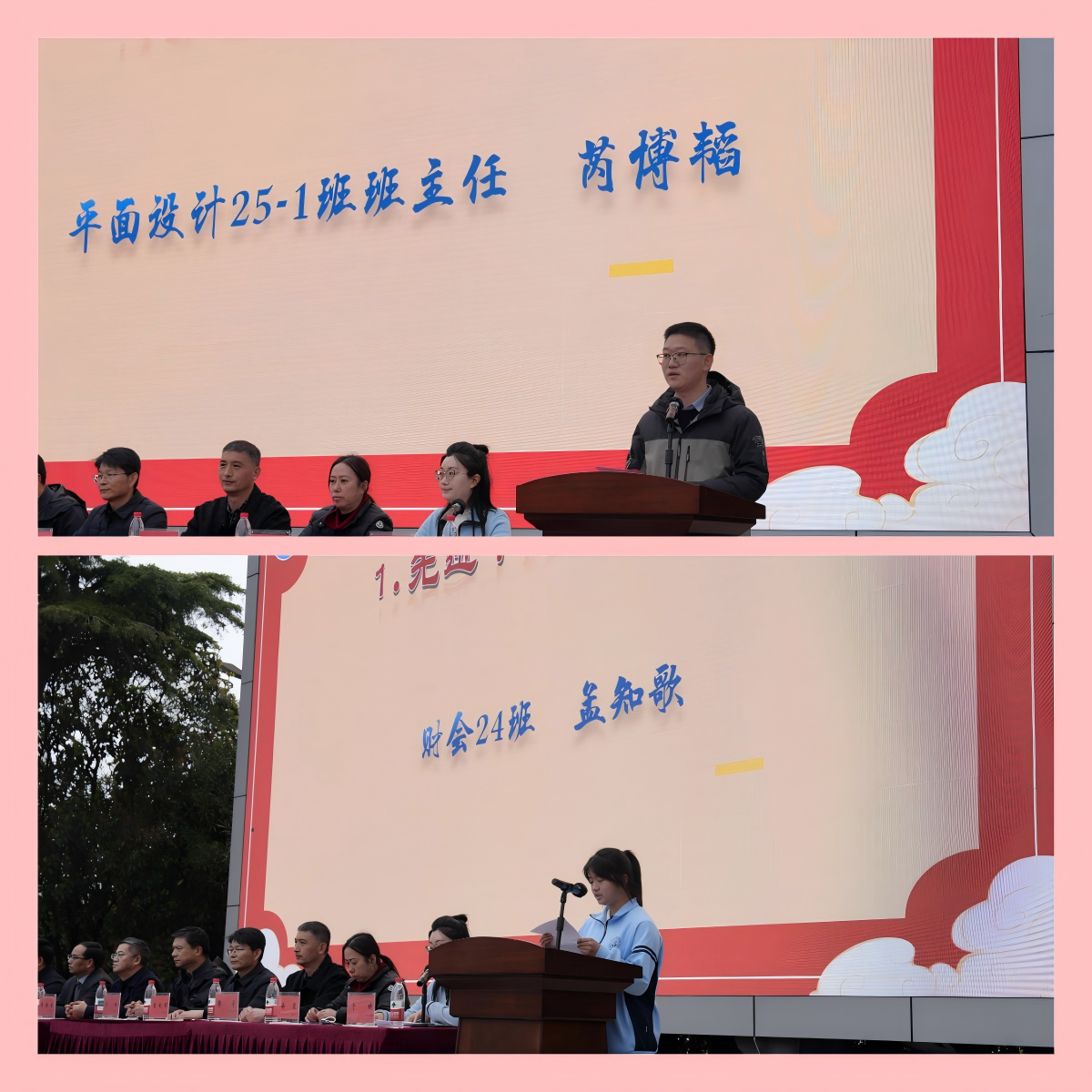 先进代表发言环节,获奖集体与个人代表依次登台分享心得与感悟。平面设计251班班主任芮博韬作为先进集体代表发言,他以“先成人,再成才”的班级管理理念为核心,分享了师生双向奔赴、凝聚集体合力的建设经验,讲述了班级在专业学习与团支部建设中齐头并进的成长故事,让在场师生深刻感受到优秀集体背后的坚守、付出与同心协力。财会24班孟知歌作为特等奖学金获得者代表发言,她结合自身深耕财会专业、参与技能竞赛、服务师生的成长经历,分享了自己在学业提升、技能锤炼与全面发展中的收获与体会,真挚表达了对学校、师长的感恩之情,并表示将以此次表彰为全新起点,继续精益求精、勇攀高峰,努力成长为德才兼备的复合型技术技能人才。两位代表的发言情真意切、催人奋进,为全校师生树立了可学可做、可追可及的榜样。