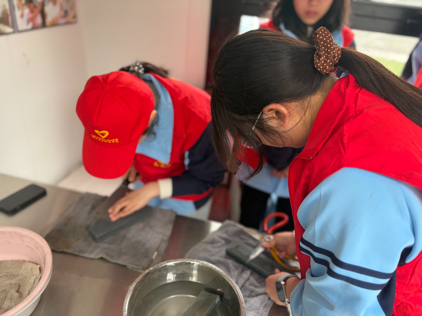 活动现场,同学们主动摆放工具、有序接待居民,全程热情饱满、细致耐心。在周杰老师的悉心指导下,大家严格按照规范打磨刀具,即便是看似费力的磨刀工作,在场女生也毫不松懈,专心致志地修整、打磨,用心把每一把刀具磨得锋利好用,用踏实的行动为居民解决生活小难题,尽显志愿服务的热忱。