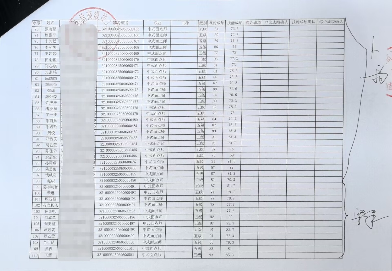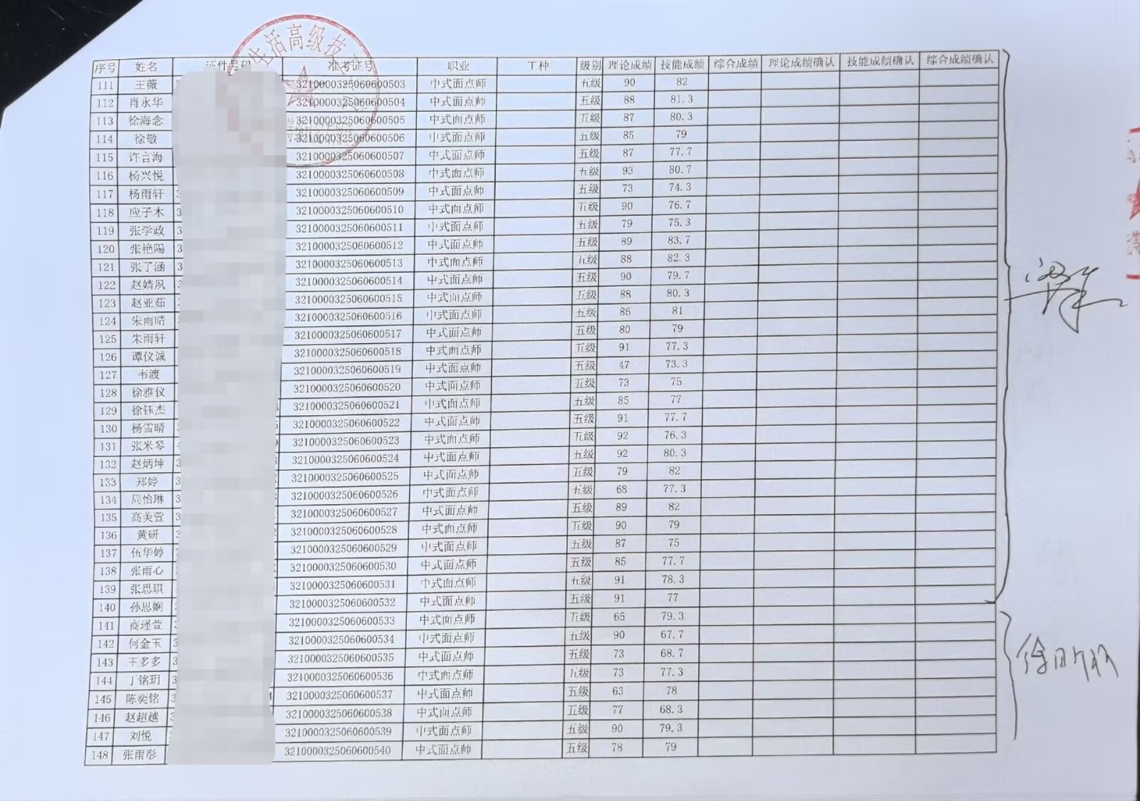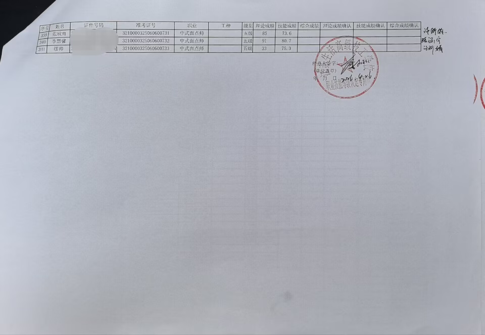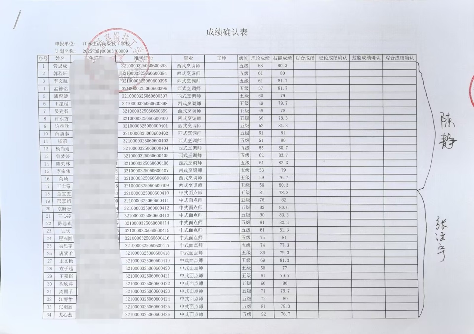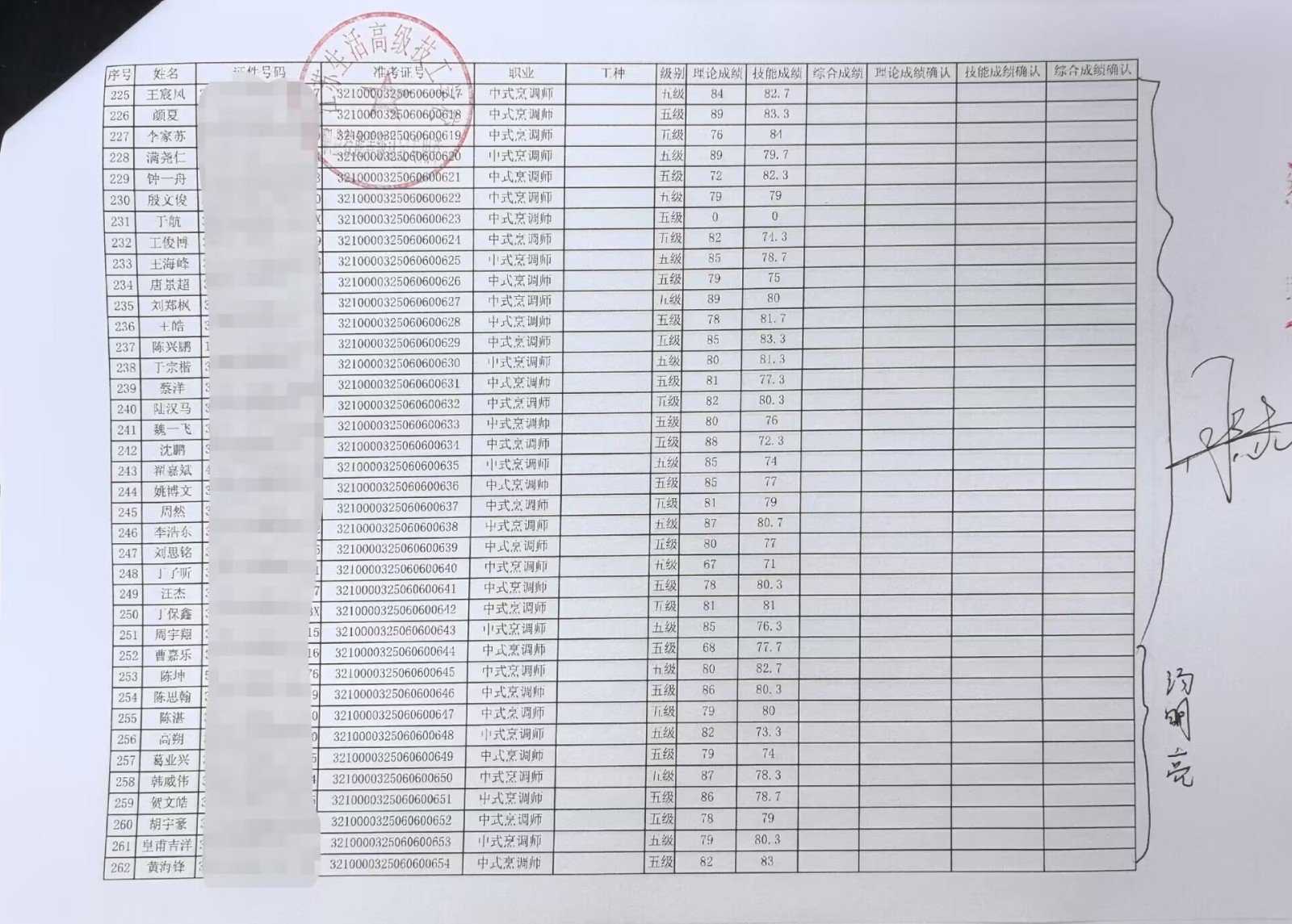 职业技能等级认定 中式烹调师5级+西式烹调师5级+西式面点师5级 2025-32100003-00009 批次成绩 公示
