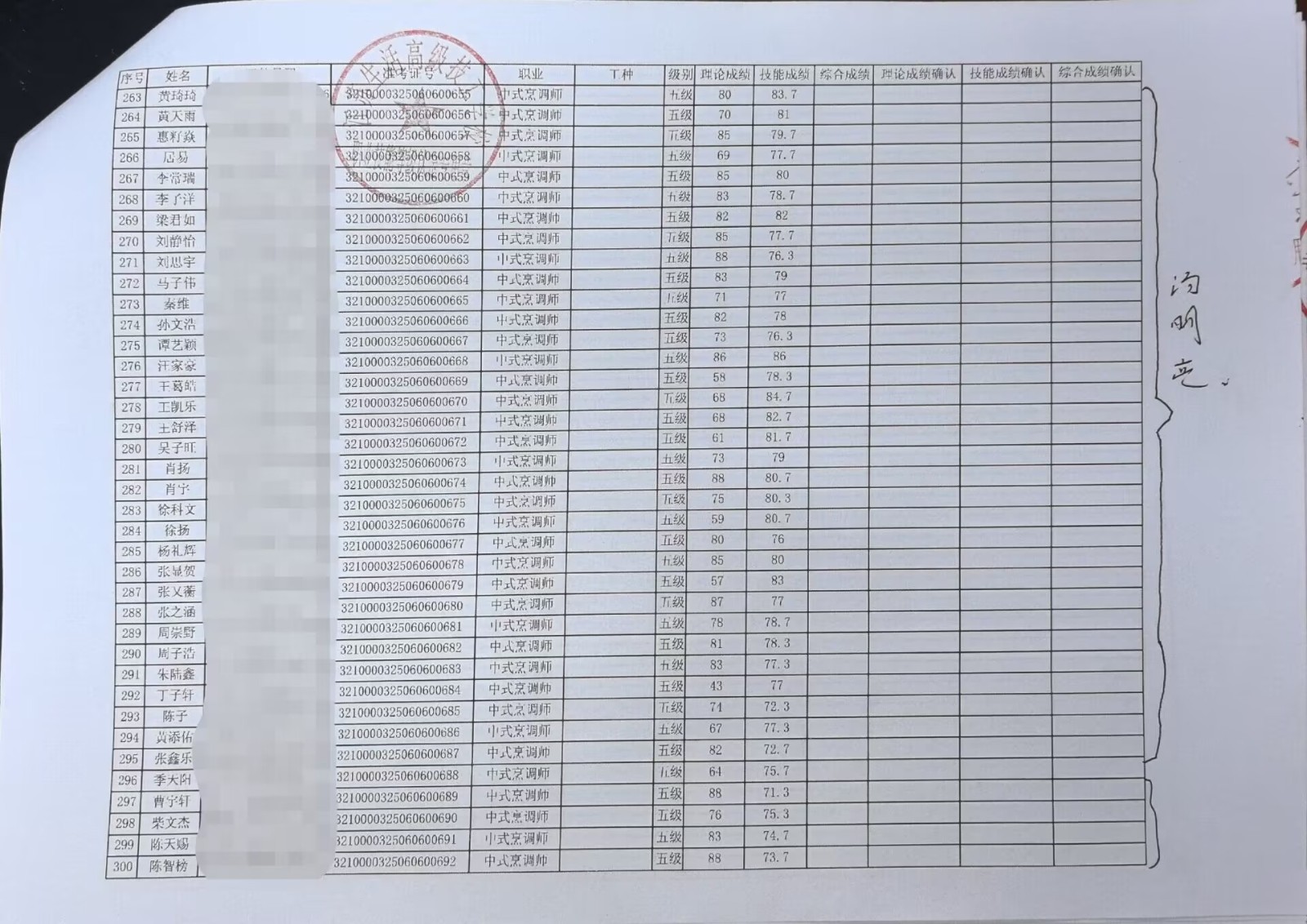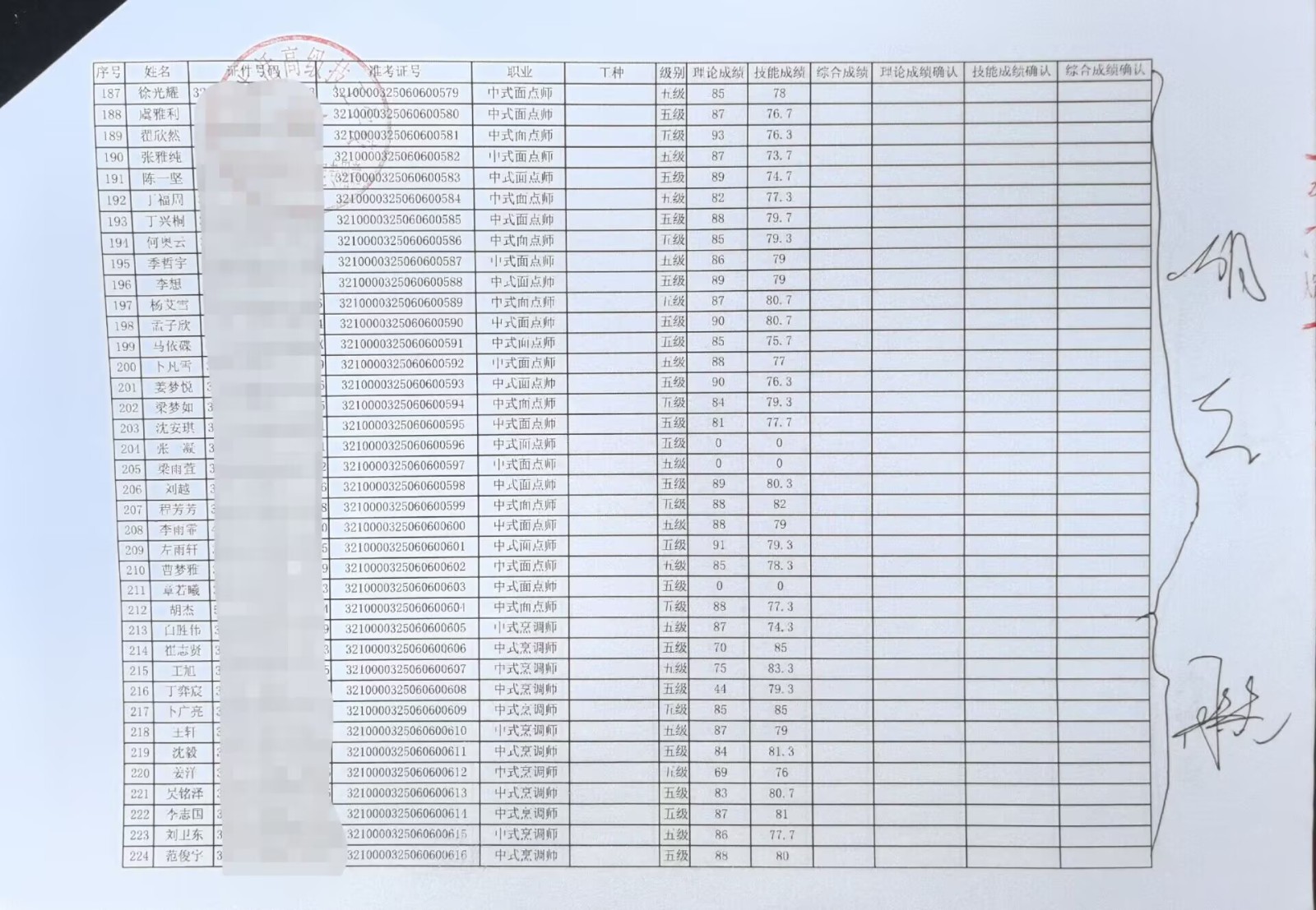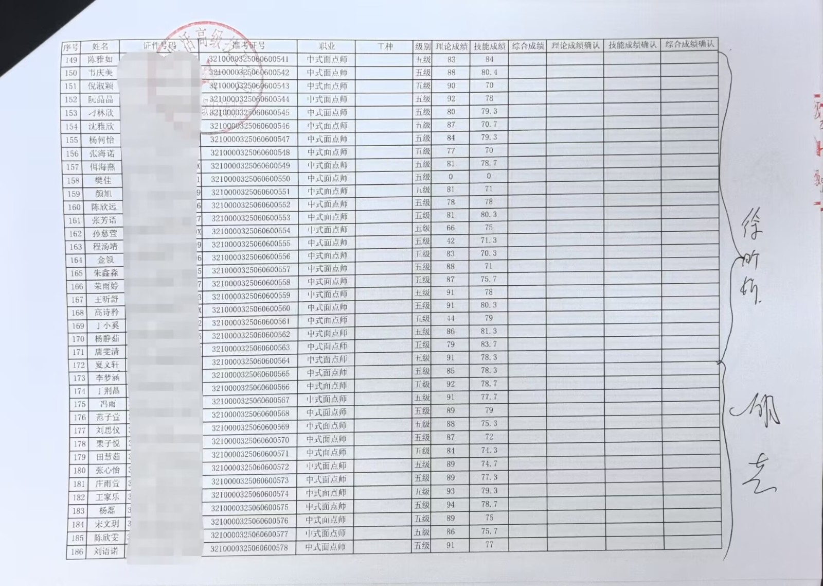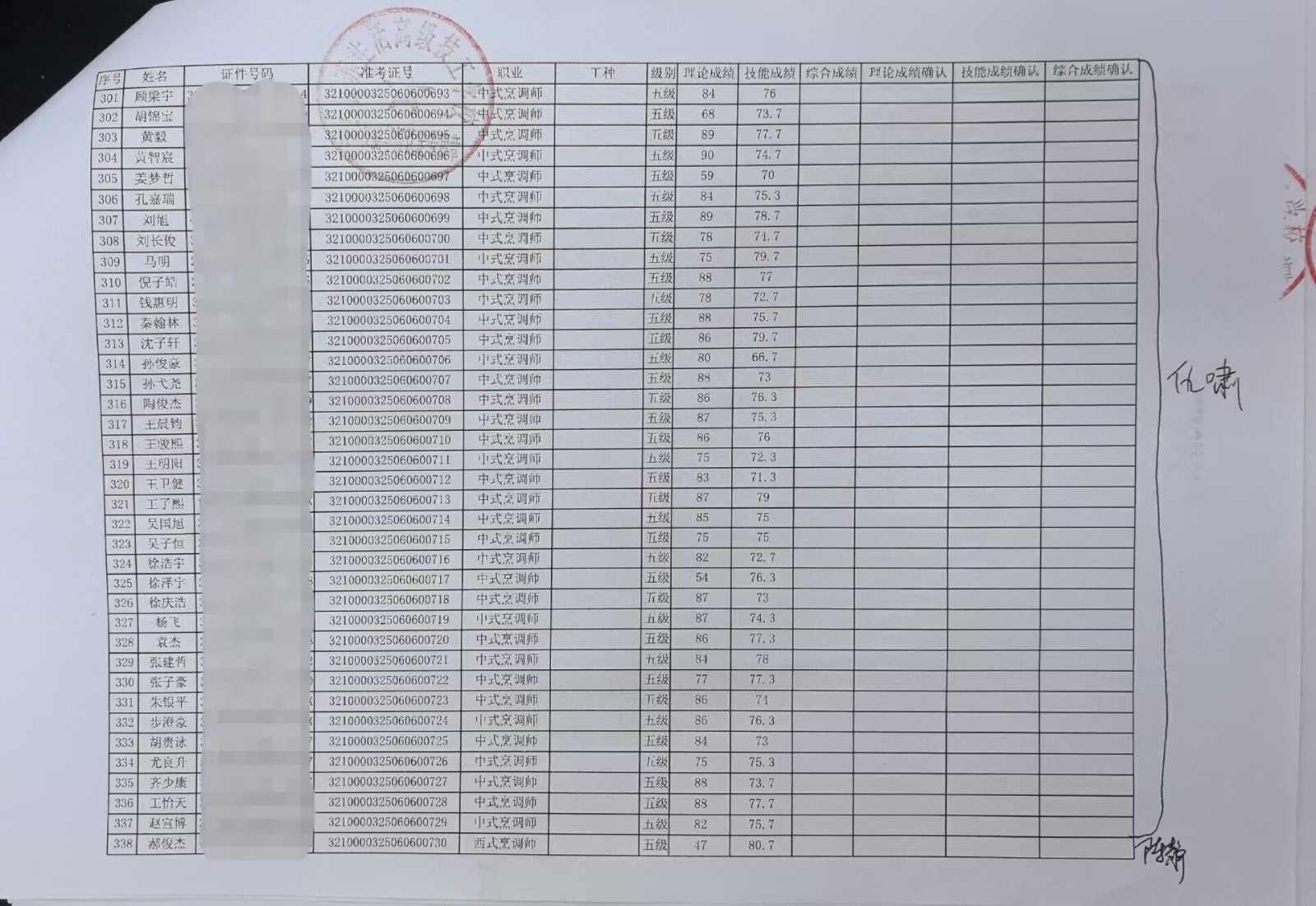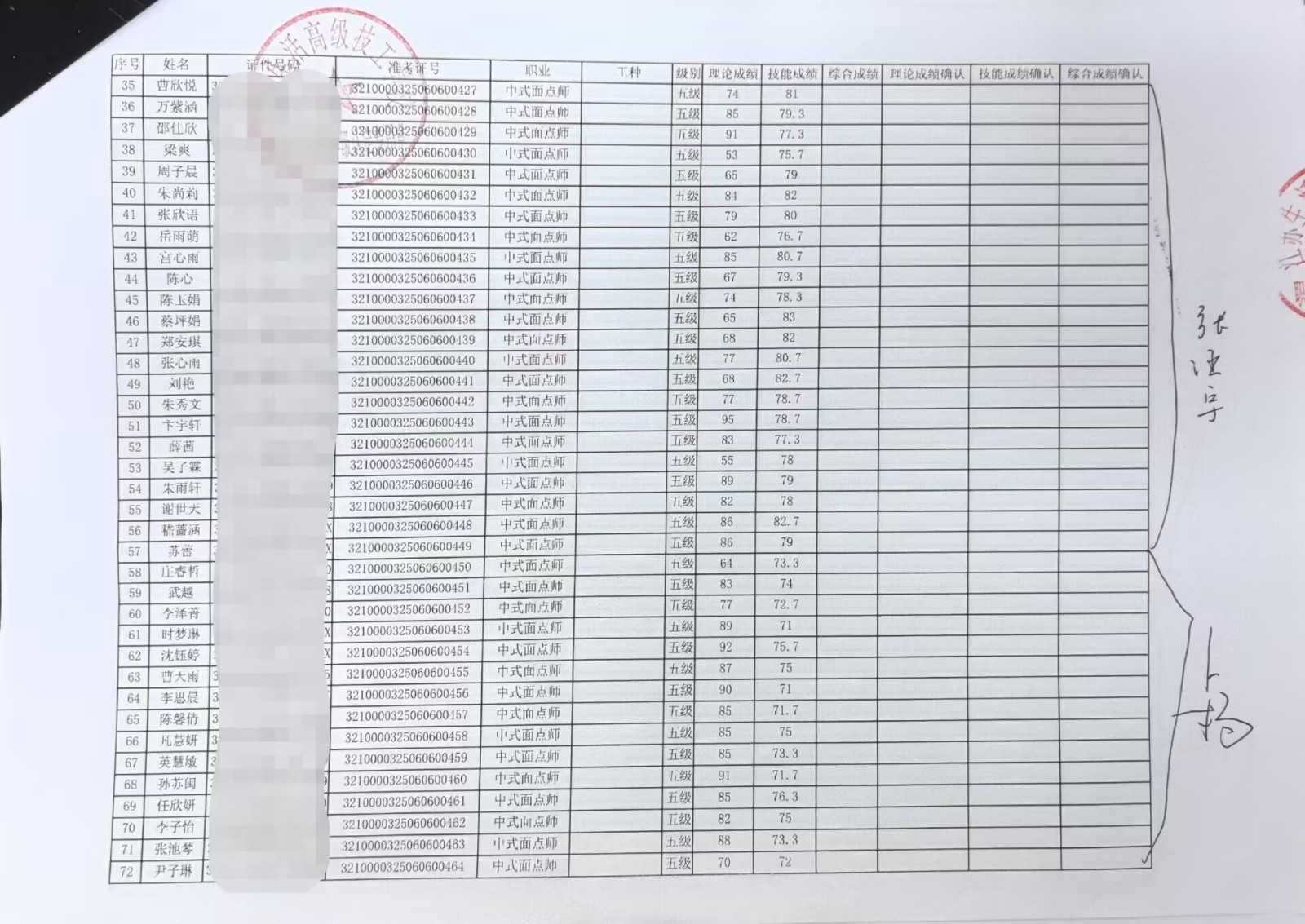 职业技能等级认定 中式烹调师5级+西式烹调师5级+西式面点师5级 2025-32100003-00009 批次成绩 公示